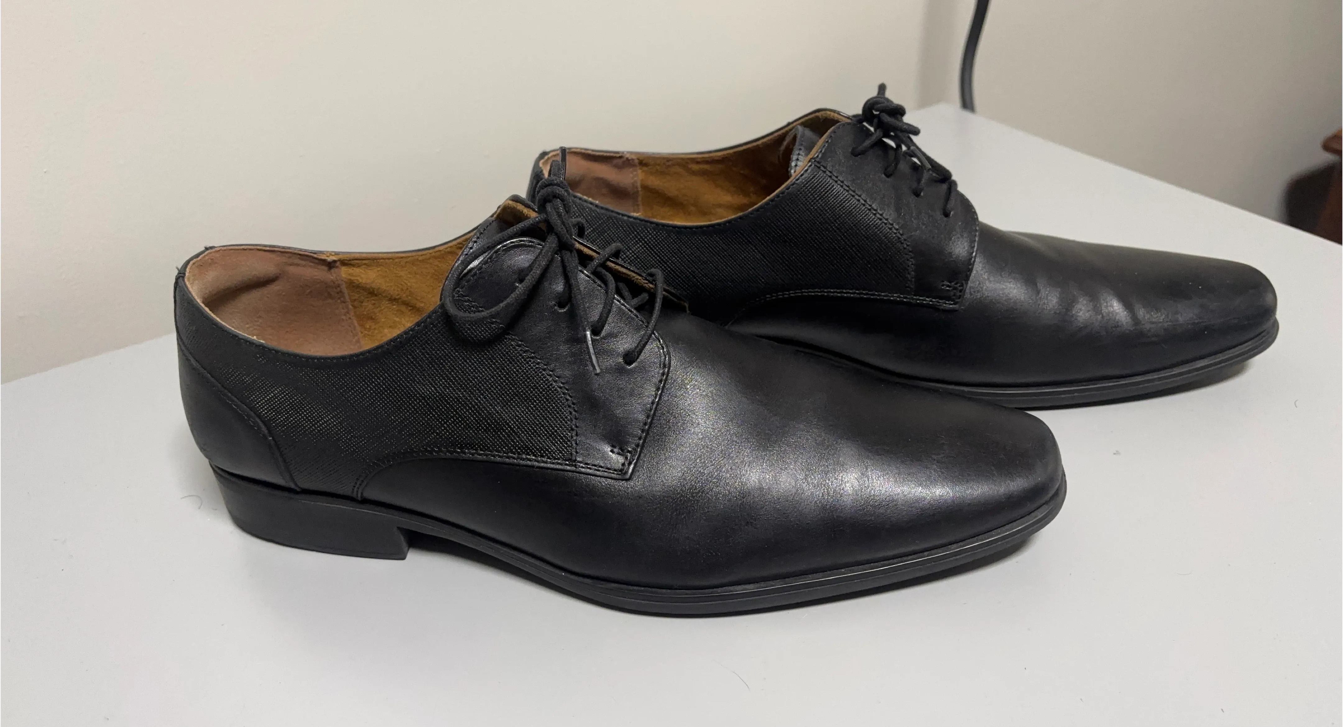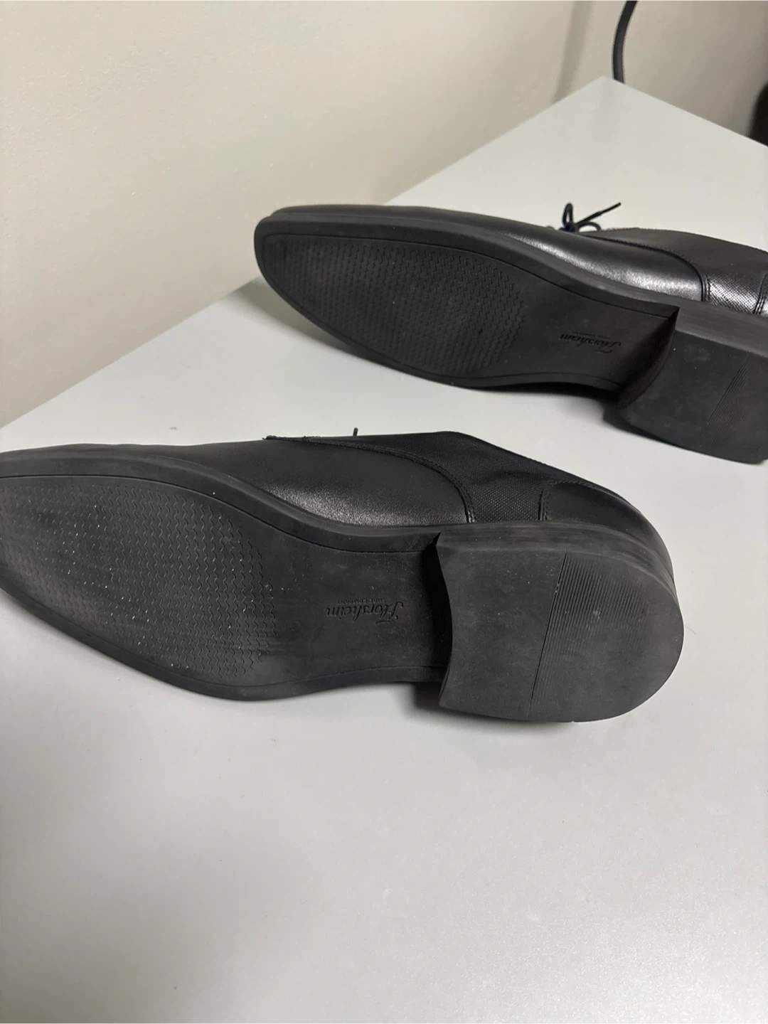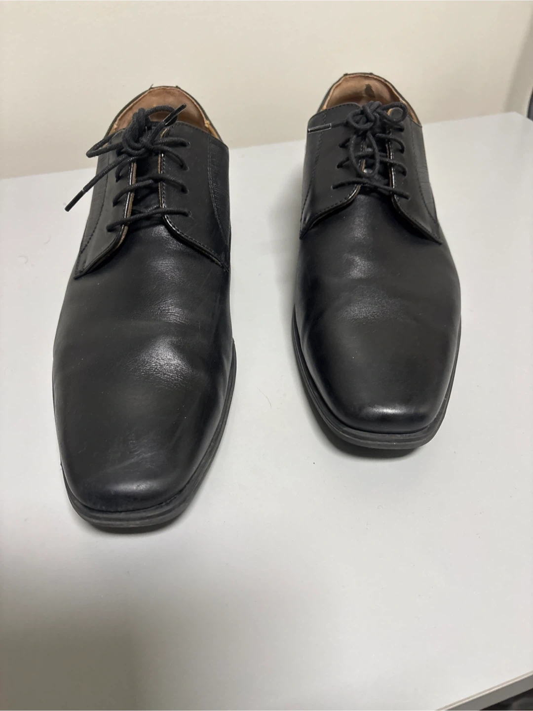 Classic black leather Oxford dress shoes from Florsheim. These shoes feature a durable sole and comfortable lining. They're suitable for formal events and business wear.