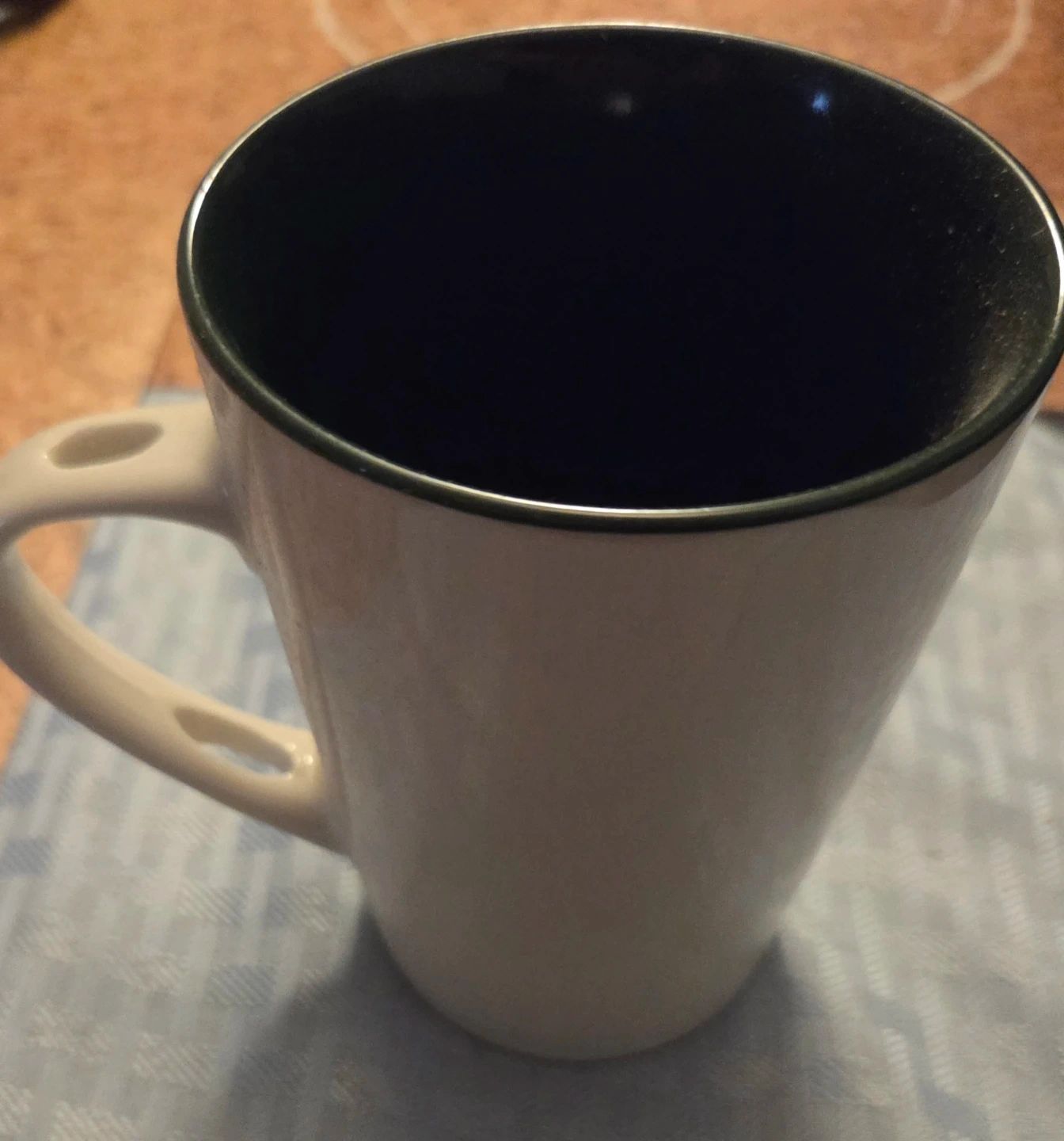 Cream coloured mug with a dark green Christmas tree design and a black rim. It's perfect for your morning coffee or tea! No spoon