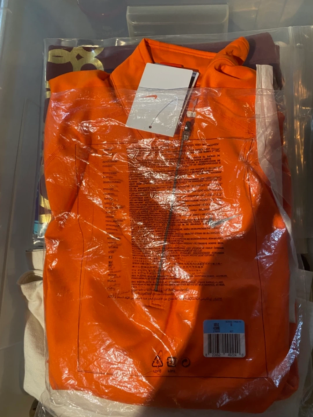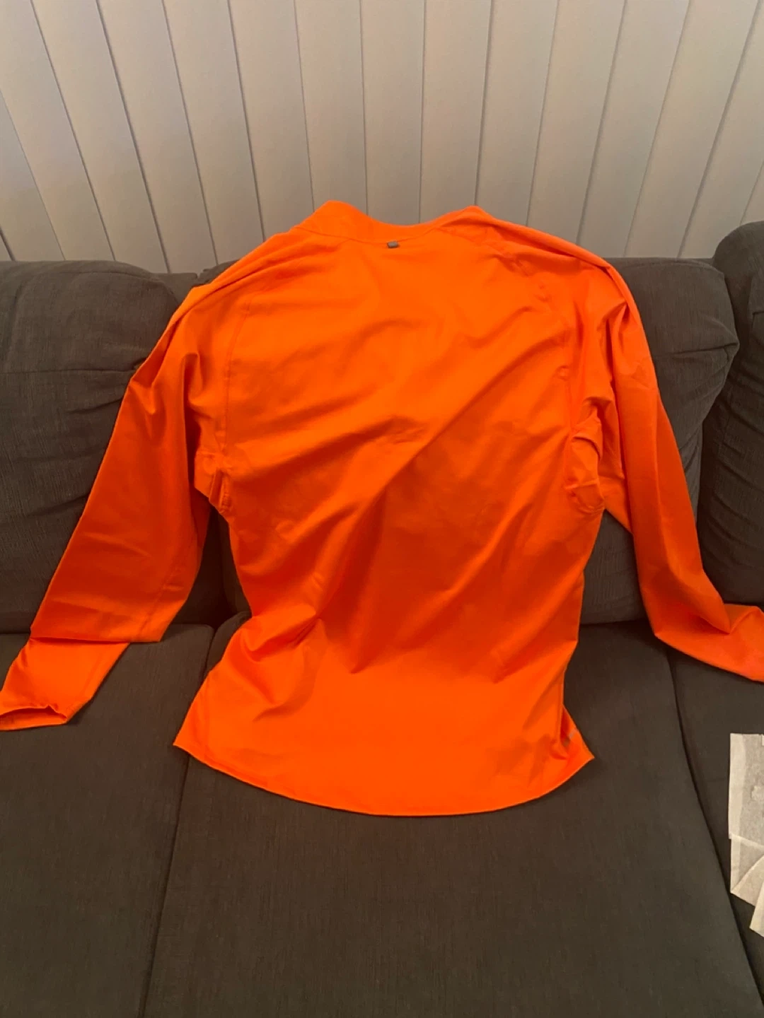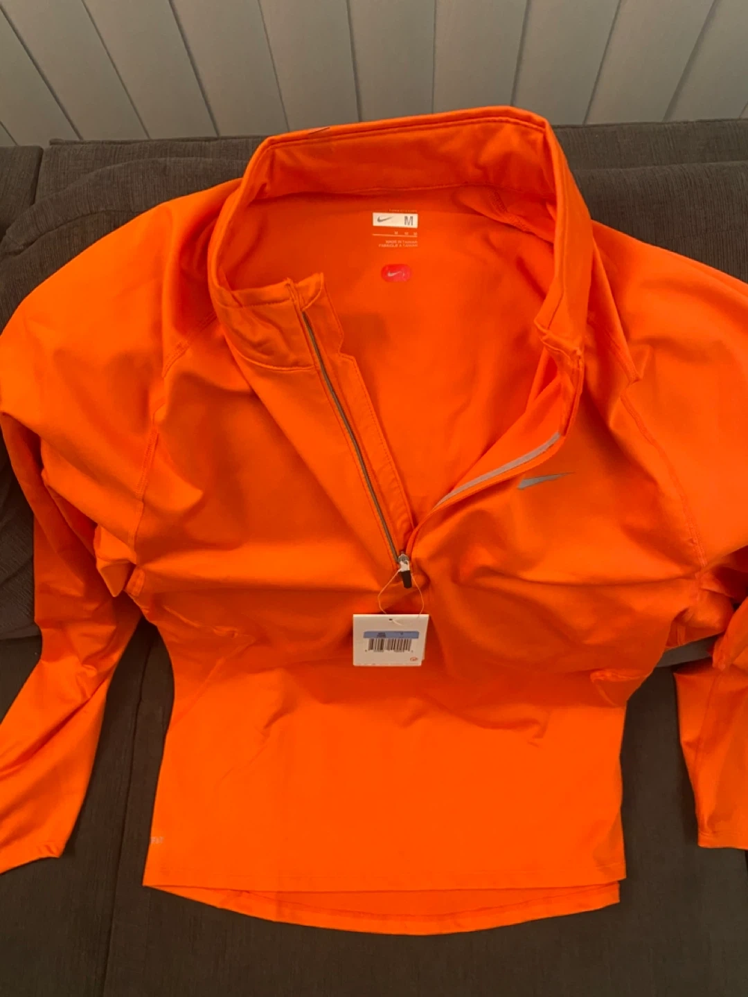 This is a bright orange long-sleeved running top from Nike. It's a size medium with a quarter-zip closure. Made with a lightweight, breathable fabric.