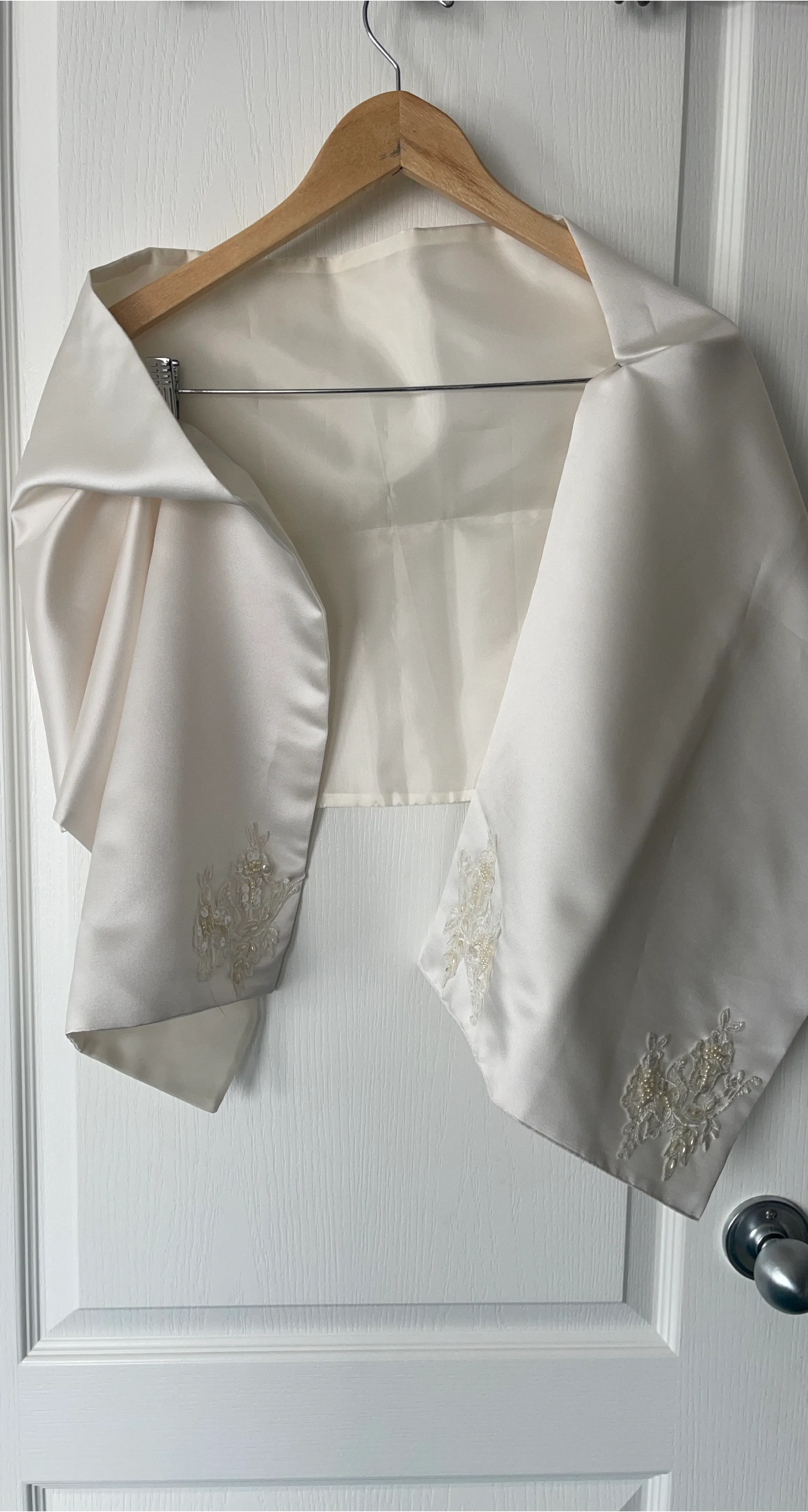 Beautiful ivory satin shawl adorned with delicate beaded embroidery on the cuffs. It's fully lined for a smooth finish. This piece is perfect for adding a touch of elegance to formal wear or a wedding outfit!