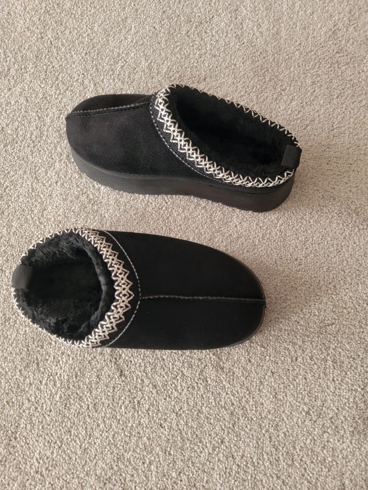 Cozy black slippers in great condition! They're a size 5 and perfect for keeping your feet warm on chilly days. The inside is super soft and comfy