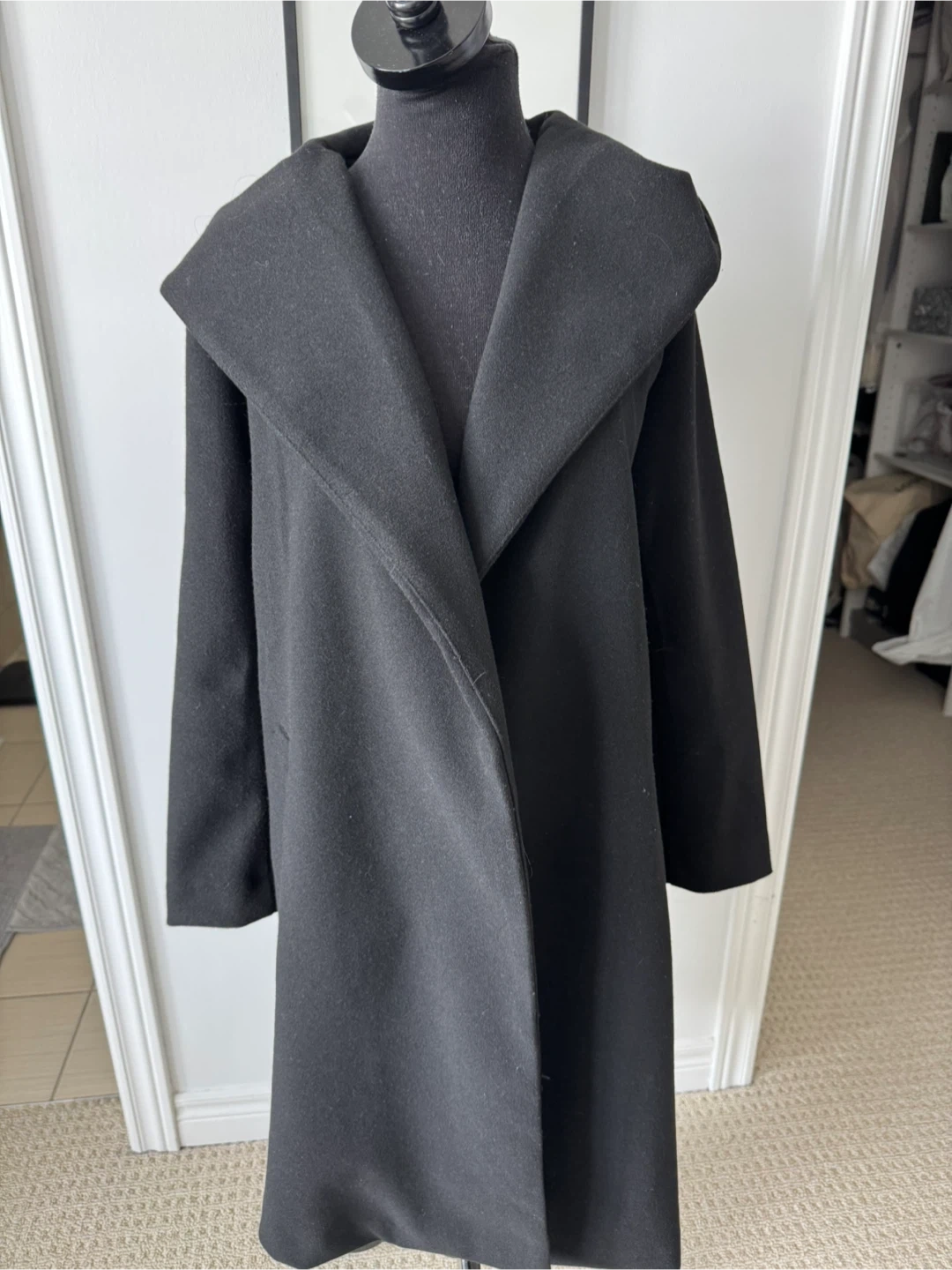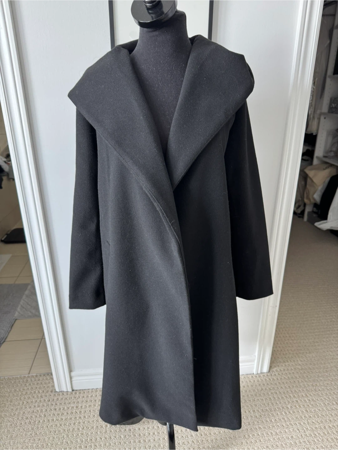 Cozy black wool blend coat with a generous hood and open front design. Features side pockets for convenience. It's a versatile layering piece for cooler weather.