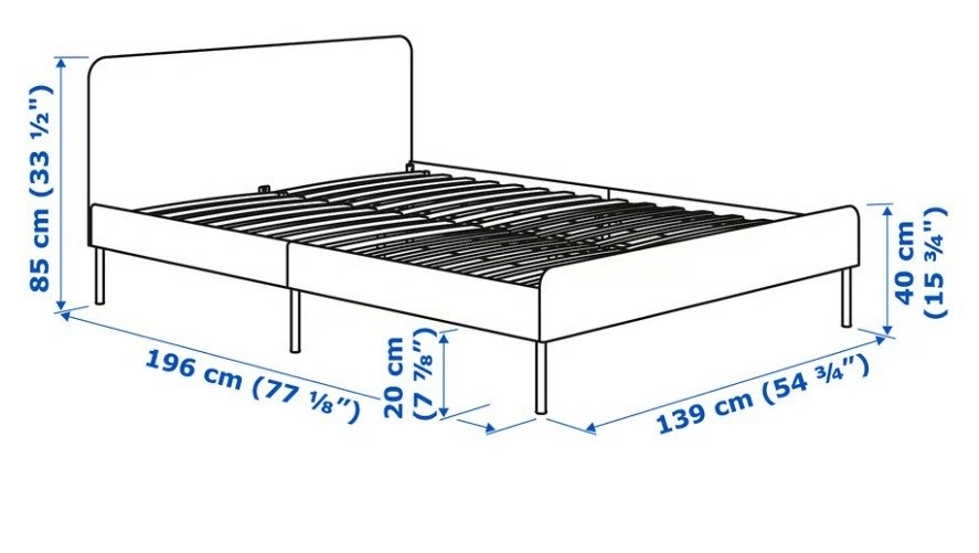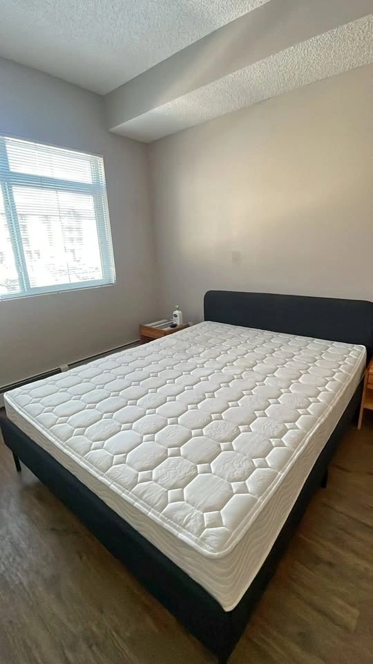 Selling a full-size upholstered bed frame in dark gray (IKEA style), including a mattress. Both the bed frame and mattress are in like-new condition — only purchased in October and barely used due to travel. Includes bed frame and mattress. Mattress is almost new (bought in October). Easy to assemble and disassemble. Strong and stable structure. Modern and minimalist design. Dimensions: Frame Length: 196 cm (77 1/8"), Frame Width: 139 cm (54 3/4"), Footboard height: 40 cm (15 3/4"), Headboard height: 85 cm (33 1/2"). Mattress Length: 189 cm (74 3/8"), Mattress Width: 135 cm (53 1/8"). Located in Airdrie, Calgary. Asking $500. Selling because I'm moving/traveling.