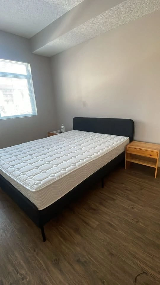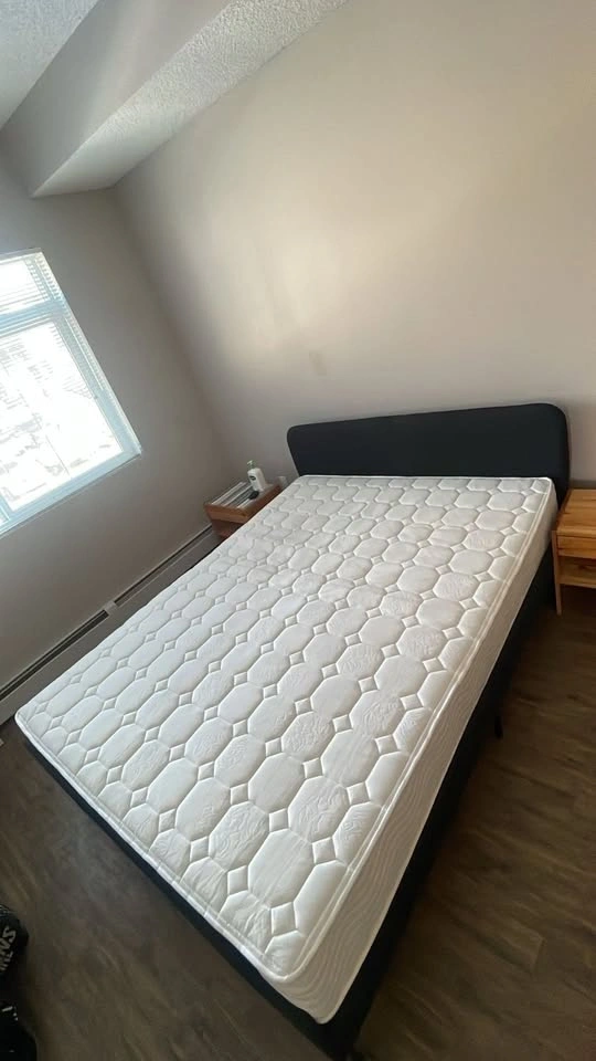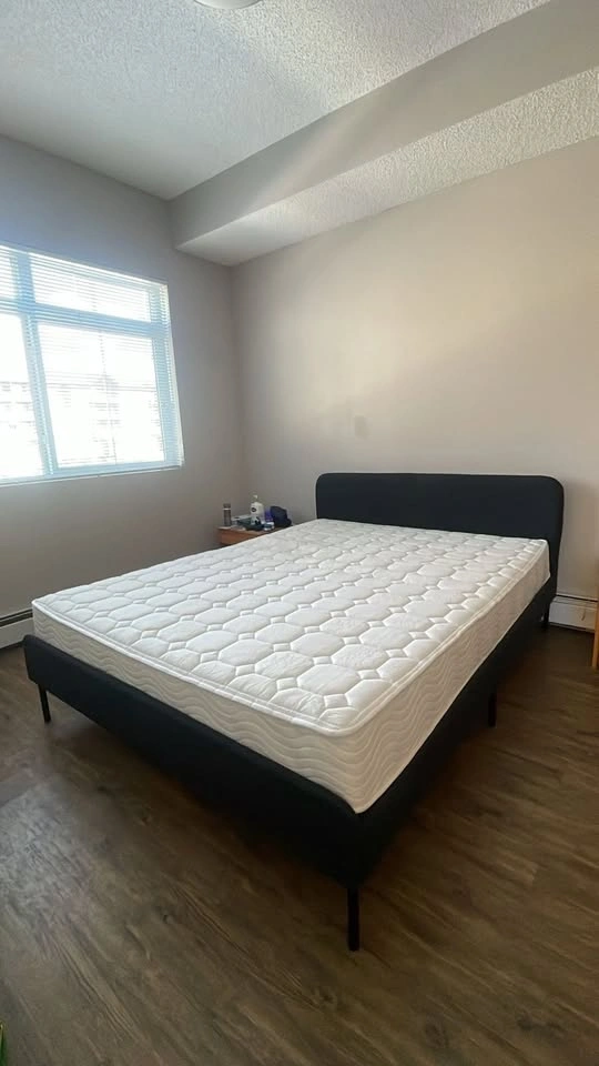 Selling a full-size upholstered bed frame in dark gray (IKEA style), including a mattress. Both the bed frame and mattress are in like-new condition — only purchased in October and barely used due to travel. Includes bed frame and mattress. Mattress is almost new (bought in October). Easy to assemble and disassemble. Strong and stable structure. Modern and minimalist design. Dimensions: Frame Length: 196 cm (77 1/8"), Frame Width: 139 cm (54 3/4"), Footboard height: 40 cm (15 3/4"), Headboard height: 85 cm (33 1/2"). Mattress Length: 189 cm (74 3/8"), Mattress Width: 135 cm (53 1/8"). Located in Airdrie, Calgary. Asking $500. Selling because I'm moving/traveling.