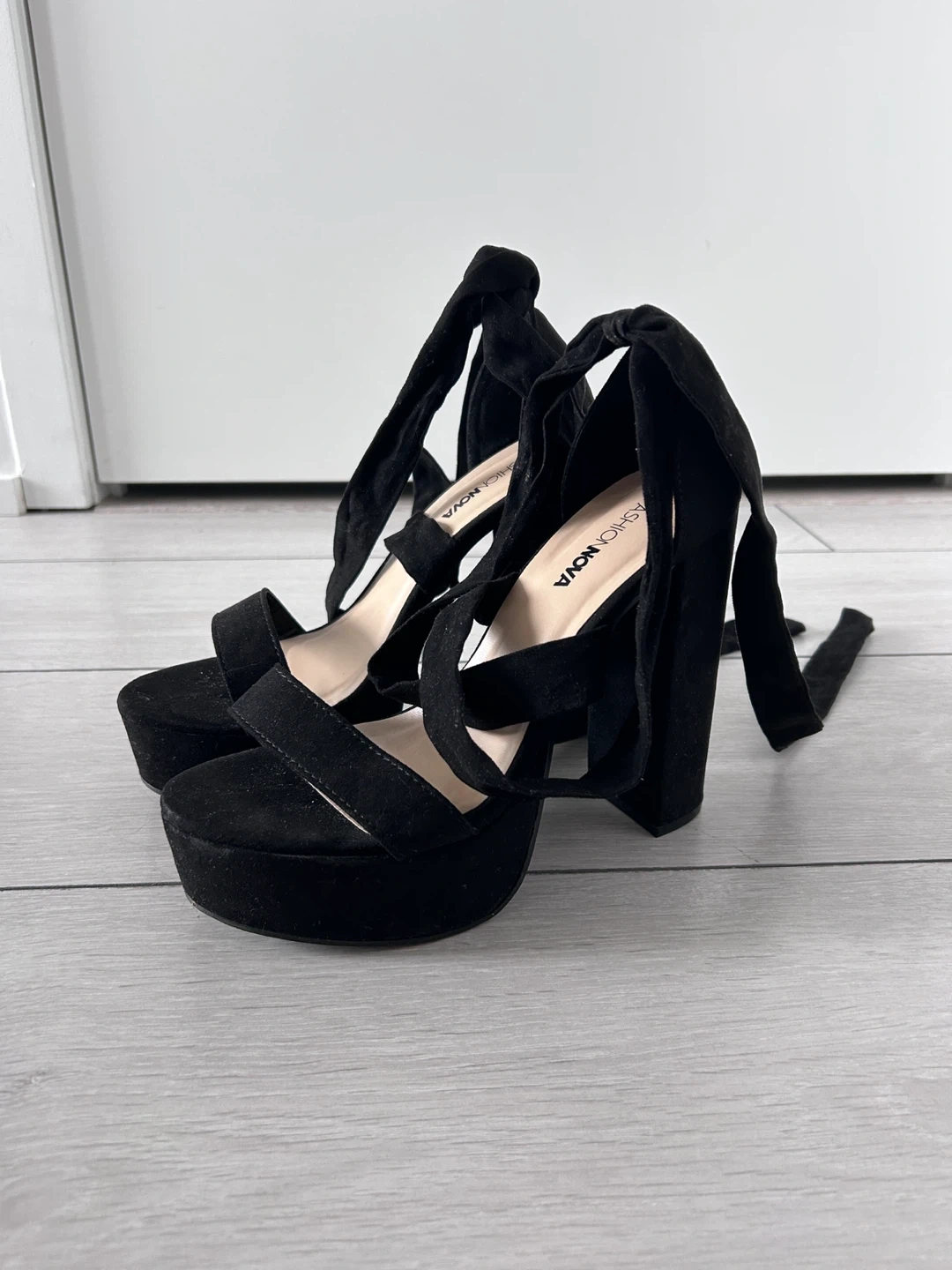 Black suede platform heels with wrap-around ankle straps. Chunky block heel design. Made by Fashion Nova.