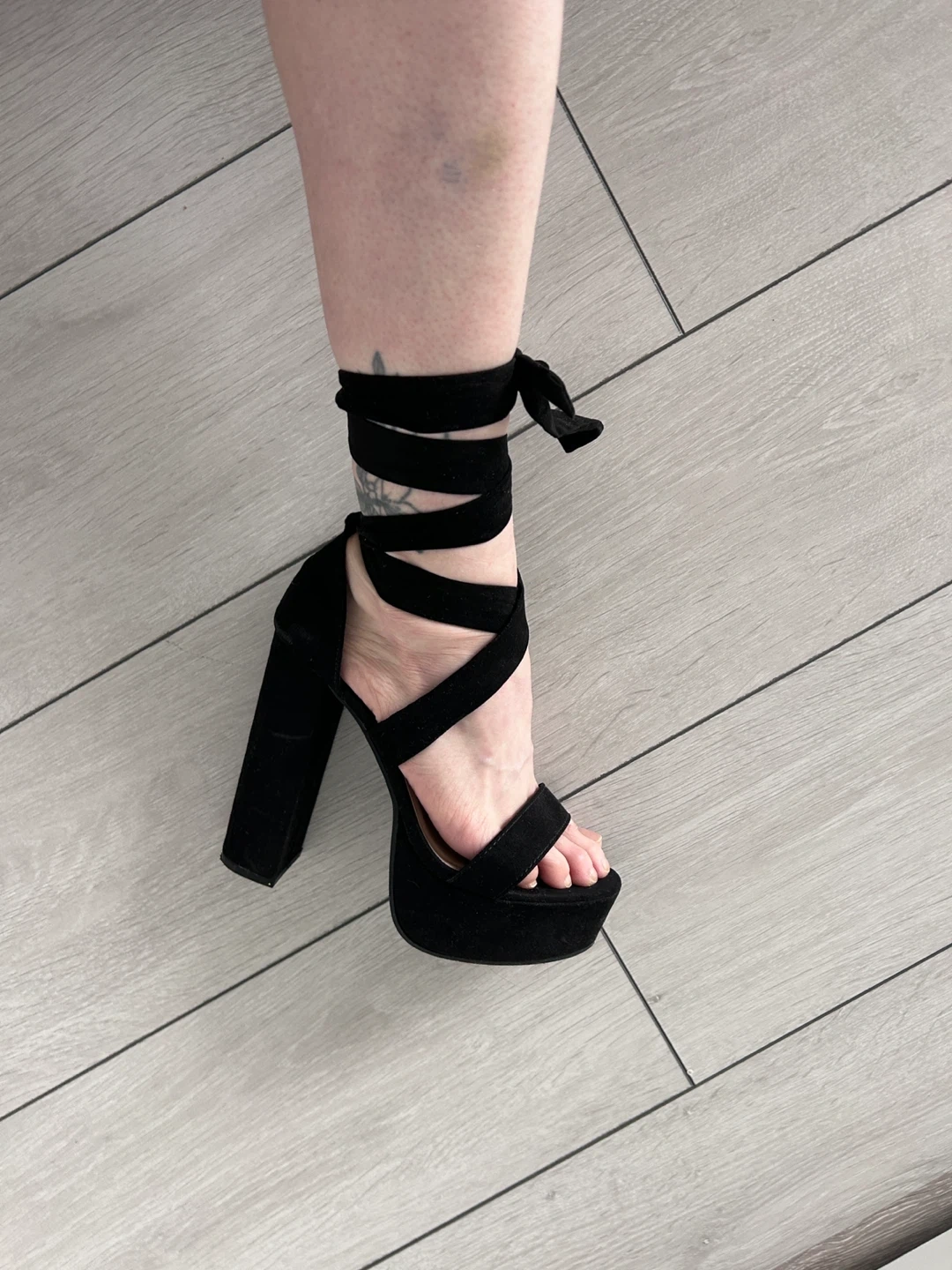 Black suede platform heels with wrap-around ankle straps. Chunky block heel design. Made by Fashion Nova.