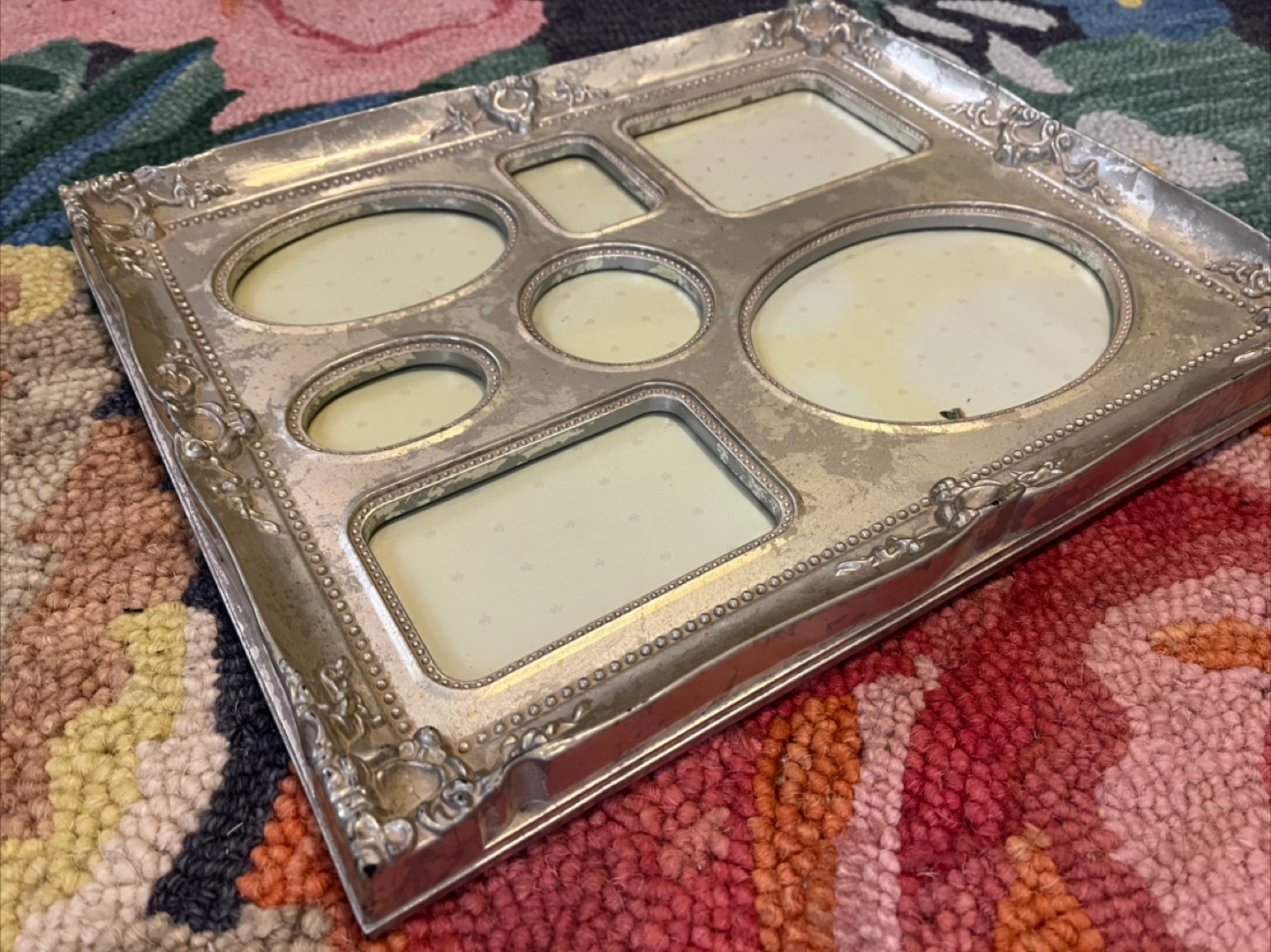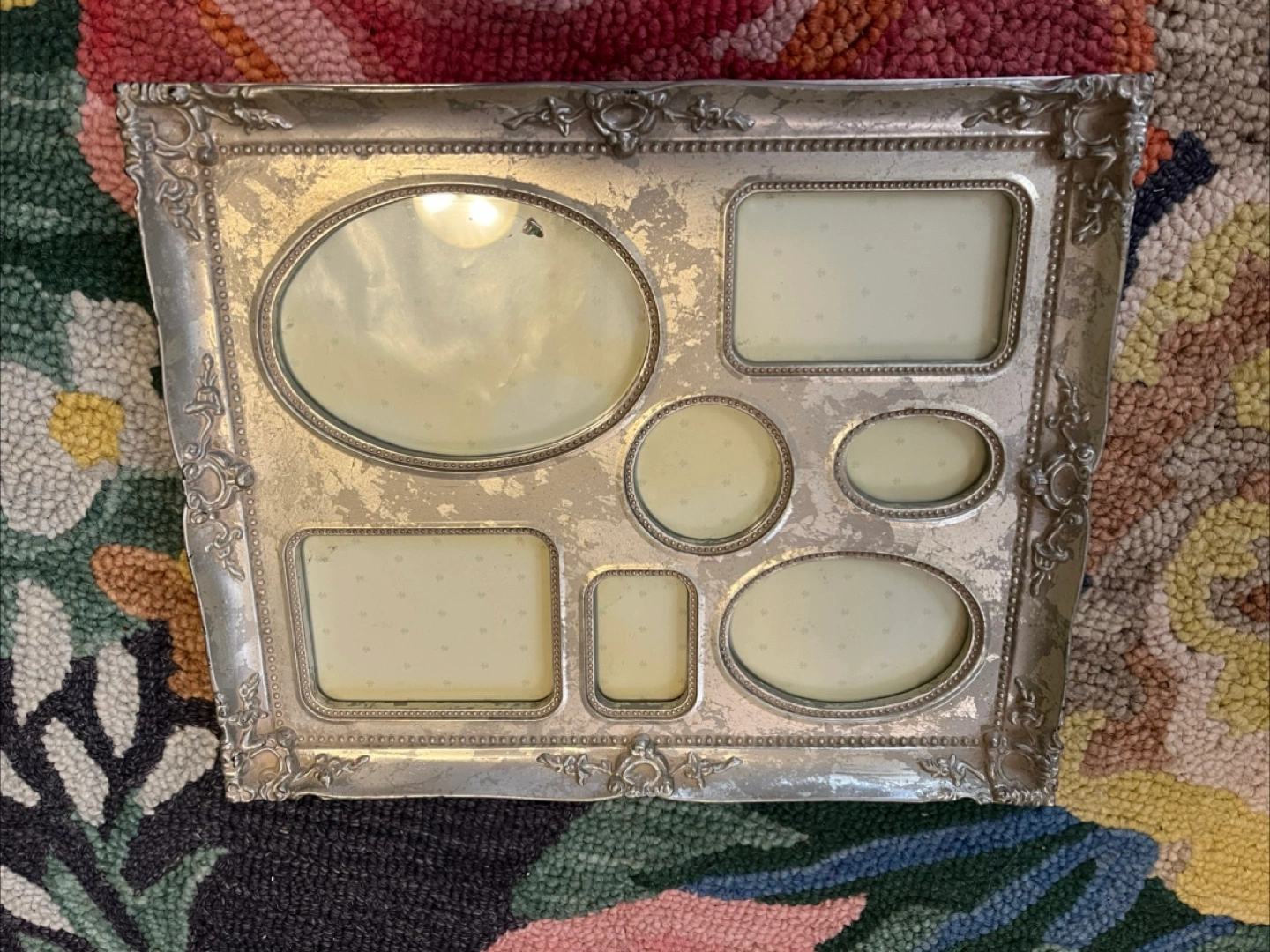 Seven photos picture frame. Ornate silver frame. Perfect for displaying family photos.
