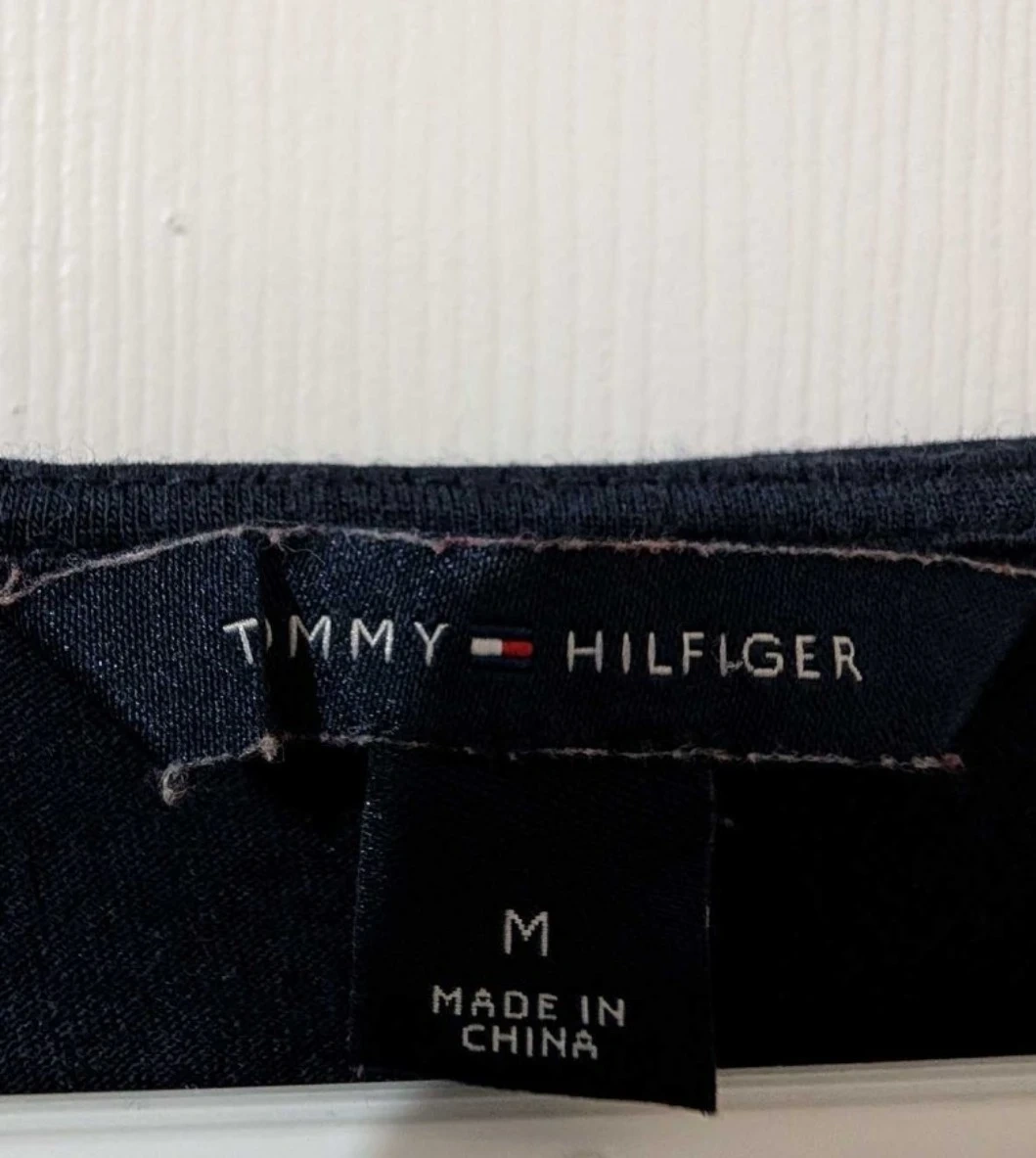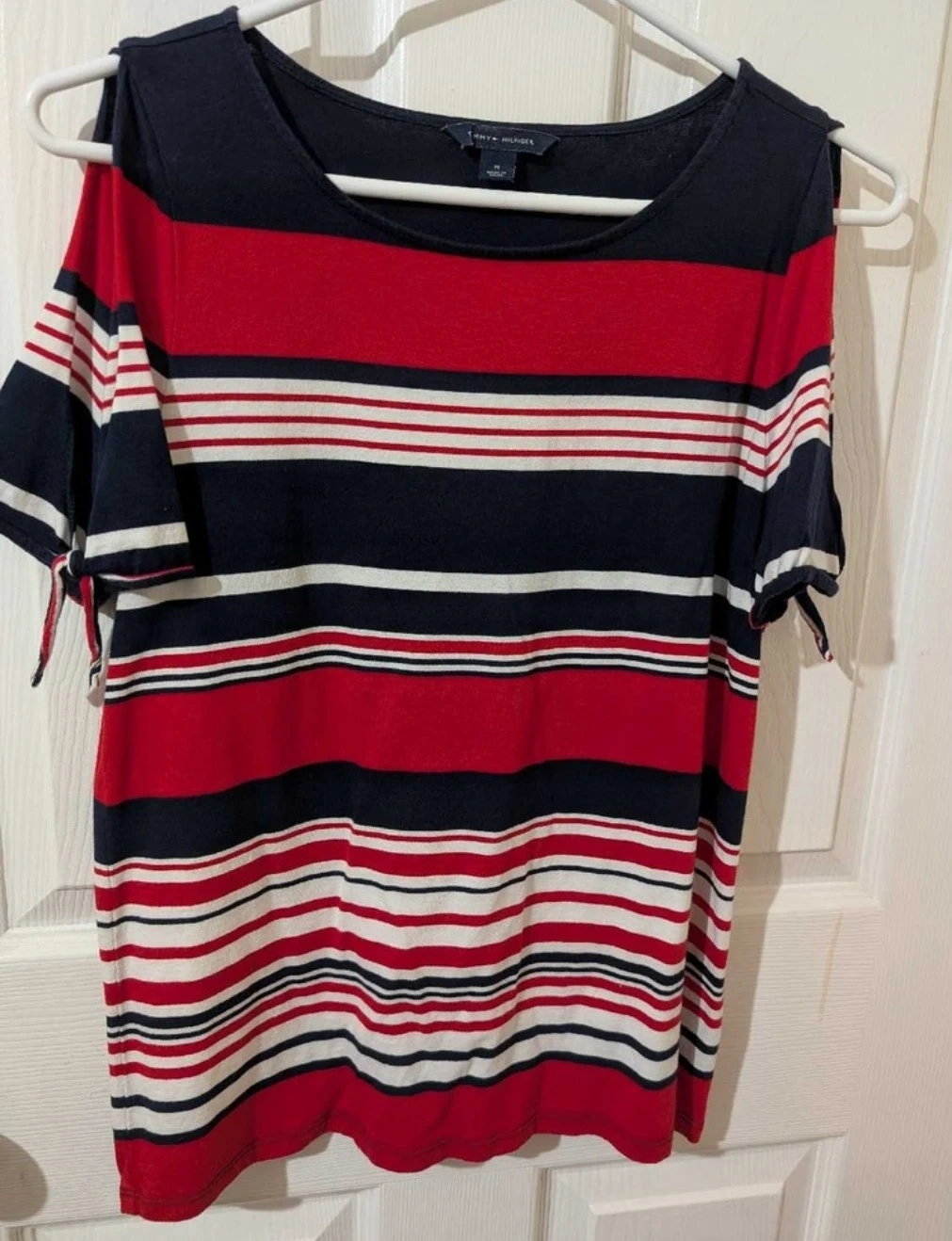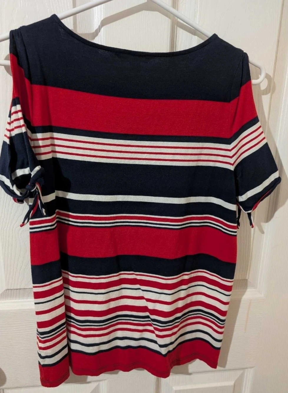 This is a Tommy Hilfiger red, white, and navy blue striped cold shoulder top with tie details on the sleeves.