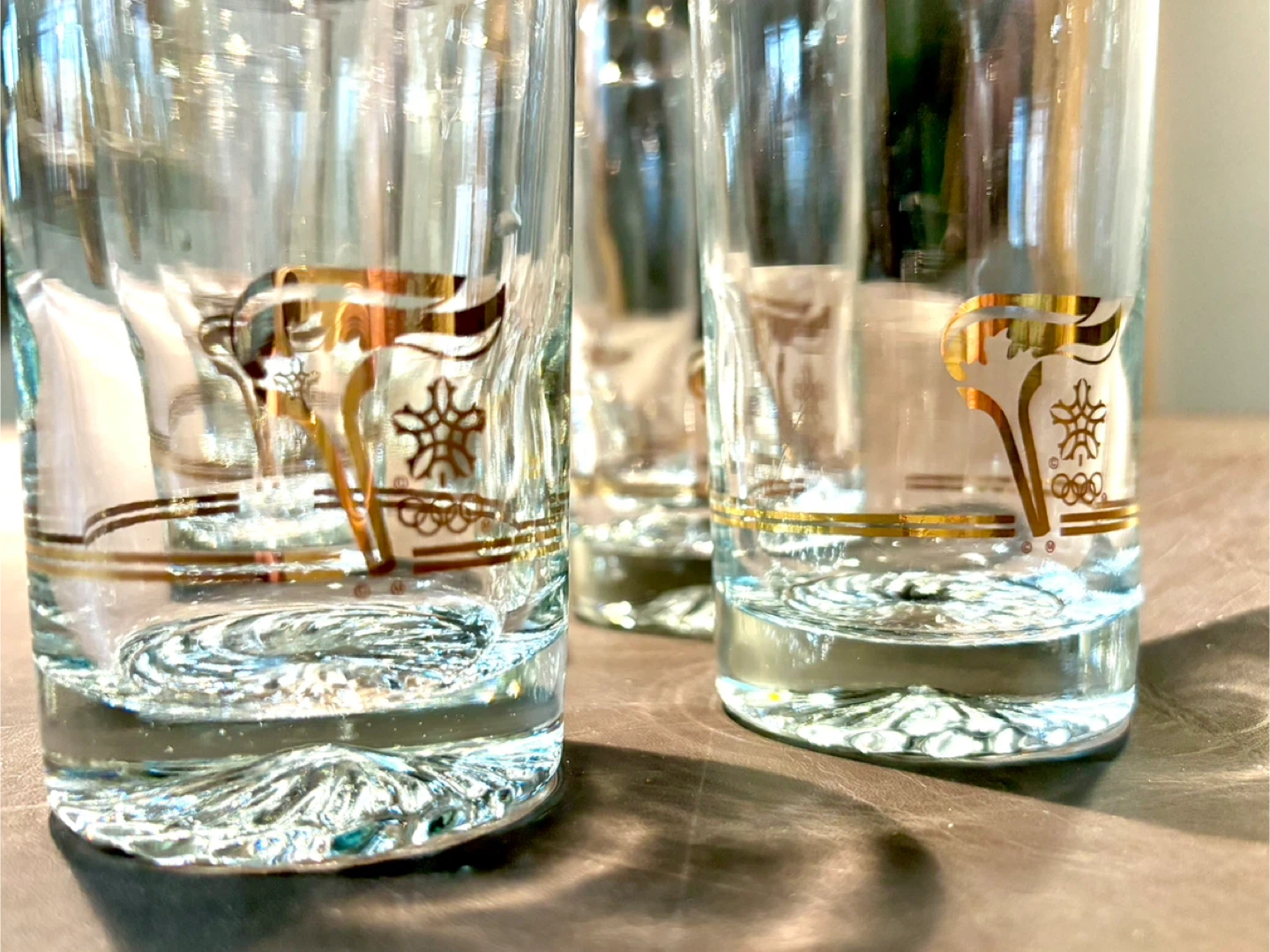 These glasses were commissioned by Petro-Canada to commemorate the 1988 Calgary Winter Olympics and the Olympic Torch Relay.