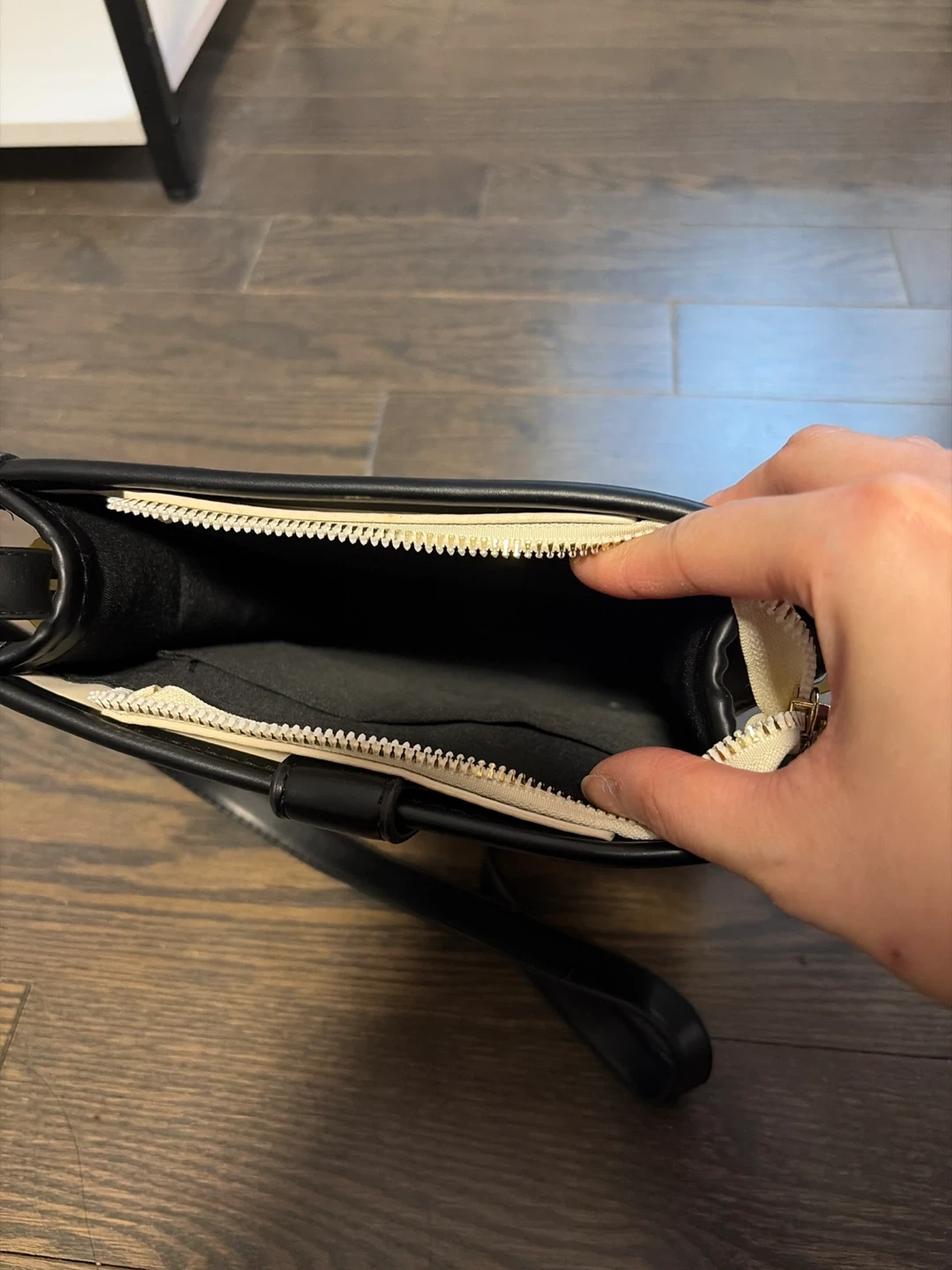 A stylish black and white crossbody bag. It has a zip closure and an adjustable strap. This bag is perfect for everyday use!
