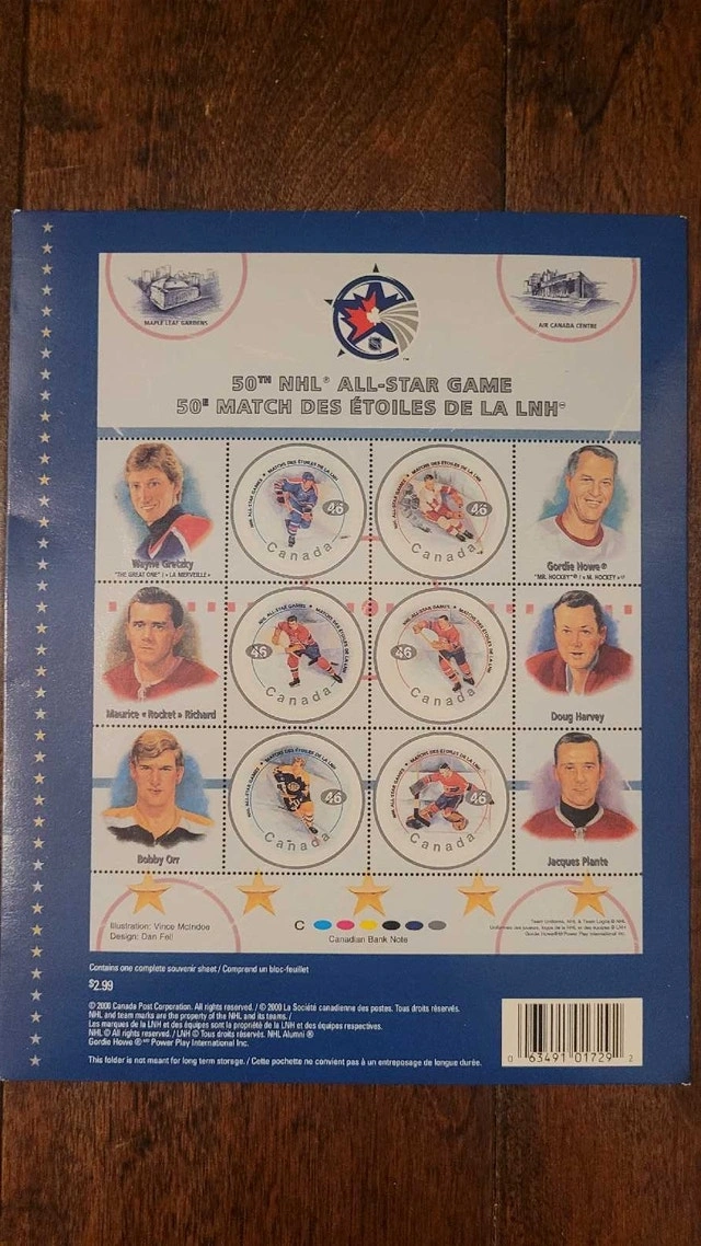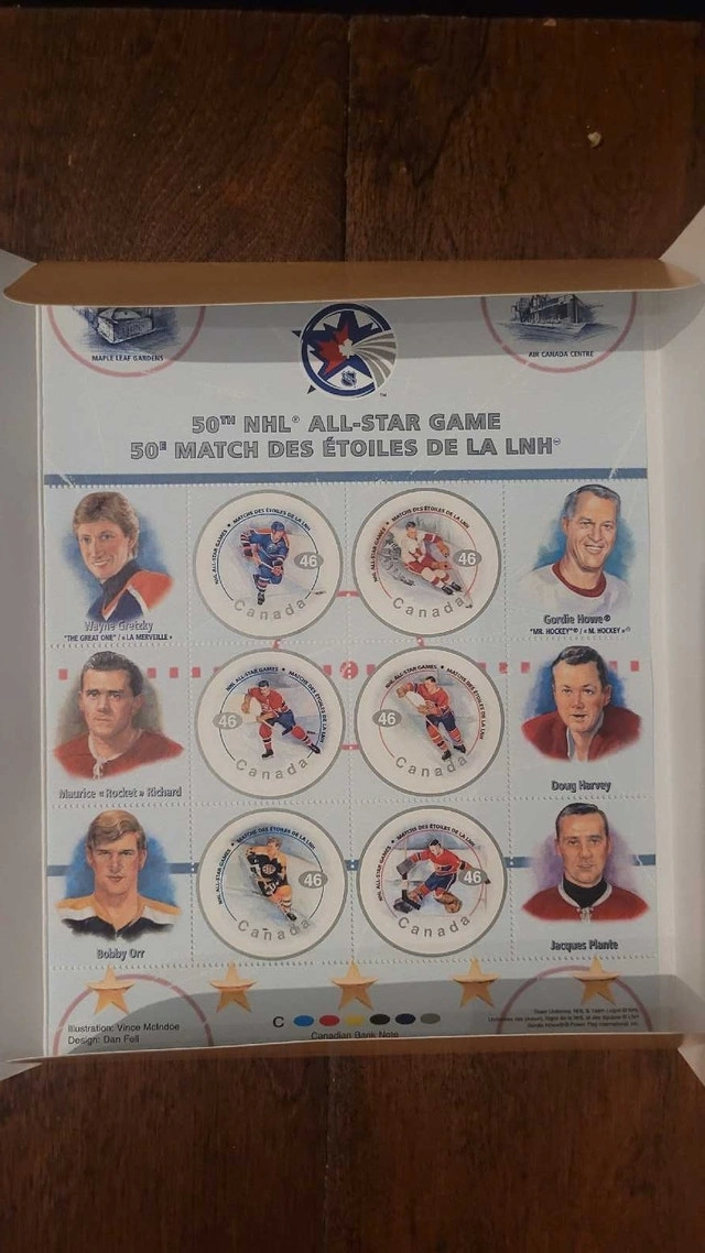 Own a piece of hockey history with this commemorative souvenir sheet celebrating the 50th NHL All-Star Game! This collectible sheet features stamps of hockey legends like Wayne Gretzky, Gordie Howe, and Maurice "Rocket" Richard. It's in excellent condition, a must-have for any hockey fan or stamp collector. From a pet and smoke-free collection. Pickup in the Lakeshore/Islington area.
