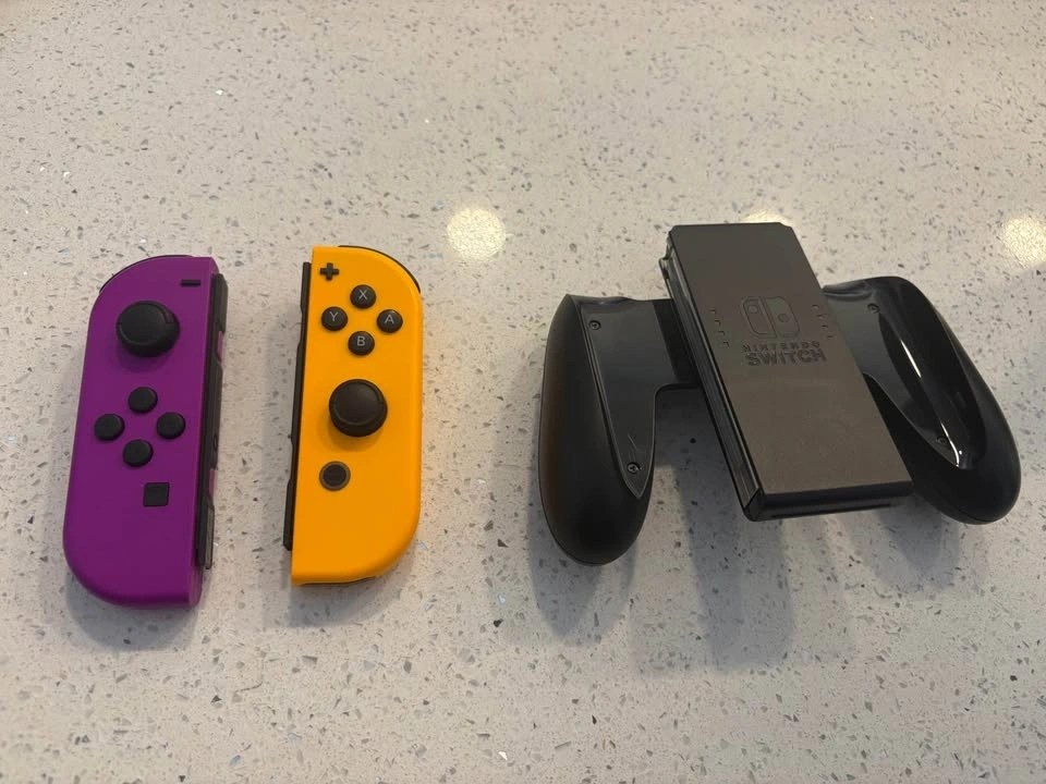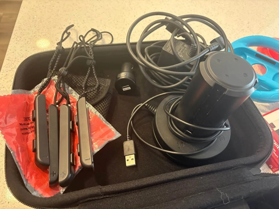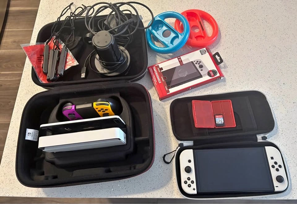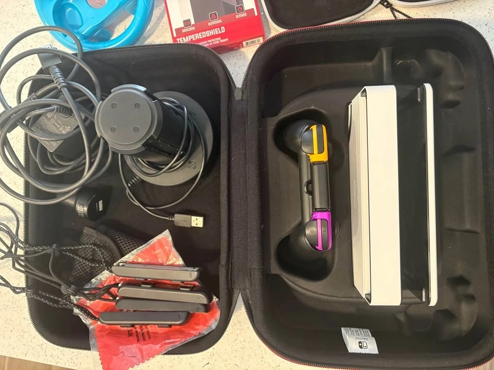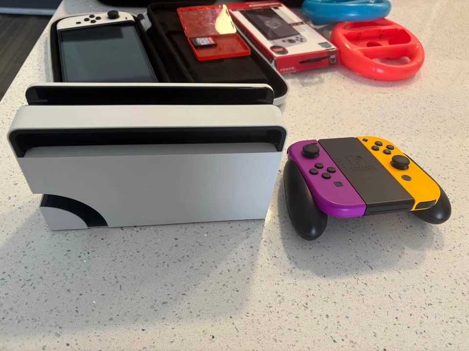 This bundle comes with an OLED Switch in very good condition. There's a very tiny scratch on the back but no other imperfections. It has a screen protector on it now and comes with a new one. Includes: Rocketfish Joy-Con Charging Station, Joy-Con controllers in Neon Purple and Neon Orange, 256GB SD card, travel case, game storage, 1 game, large storage case, wheel controllers, microfibre cloth, and all cables. Asking $425 or best offer.