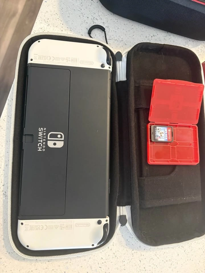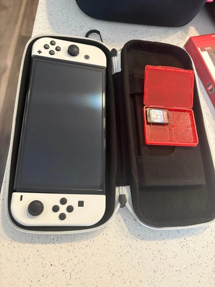 This bundle comes with an OLED Switch in very good condition. There's a very tiny scratch on the back but no other imperfections. It has a screen protector on it now and comes with a new one. Includes: Rocketfish Joy-Con Charging Station, Joy-Con controllers in Neon Purple and Neon Orange, 256GB SD card, travel case, game storage, 1 game, large storage case, wheel controllers, microfibre cloth, and all cables. Asking $425 or best offer.
