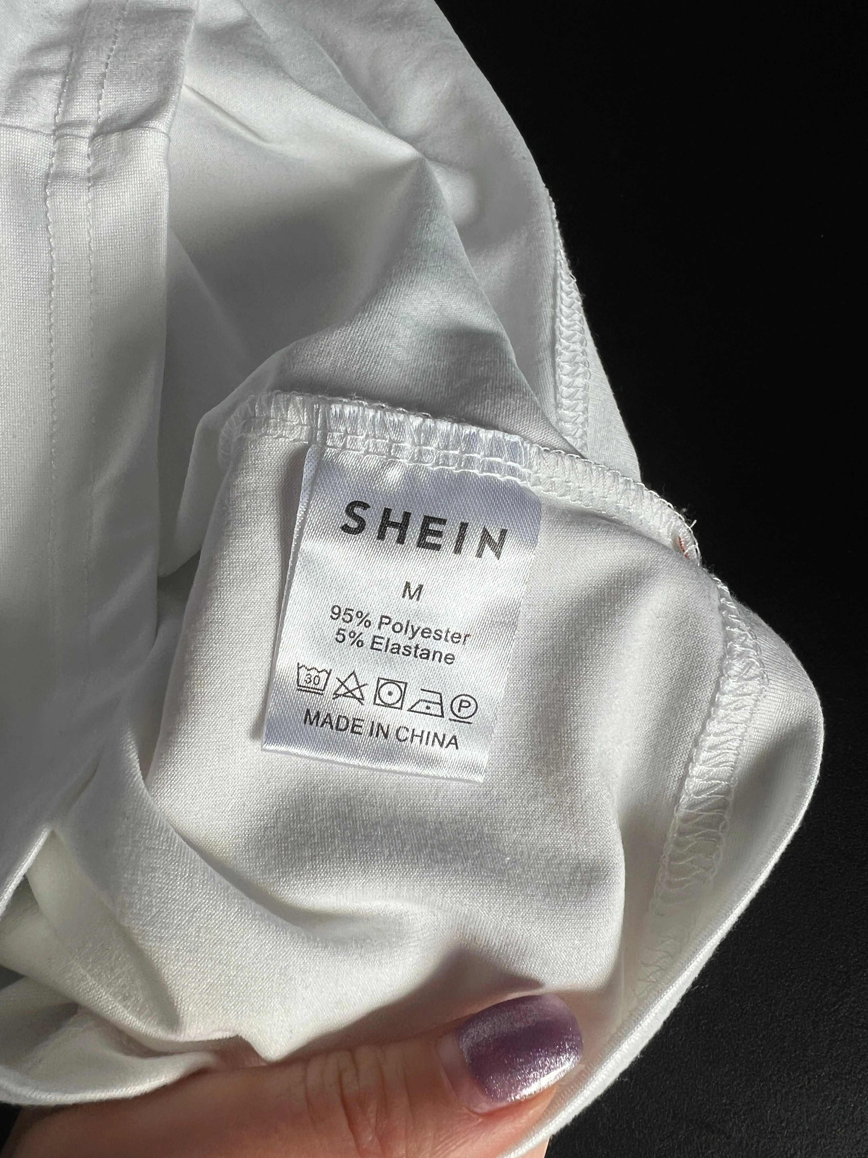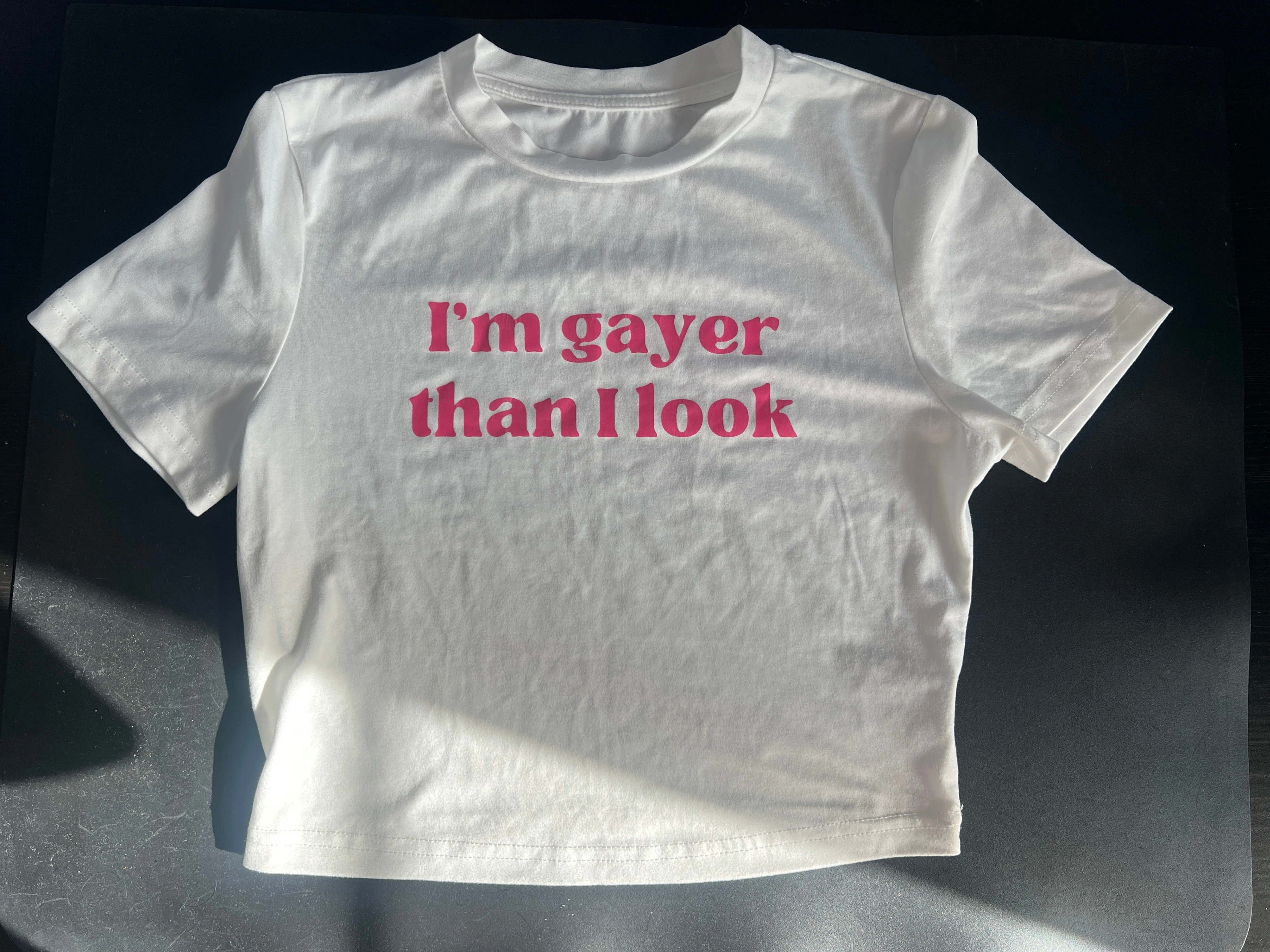 A white tee from Shein with the phrase 'I'm gayer than I look' printed in pink. The tag says size medium, but trust me it is definitely NOT a normal medium. It's a small for sure. Super soft fabric. Only worn once.