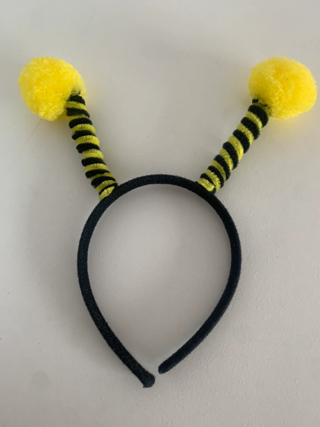 Cute bee antennae headband, perfect for a costume or just for fun! It features black and yellow stripes with fluffy yellow pom poms on top