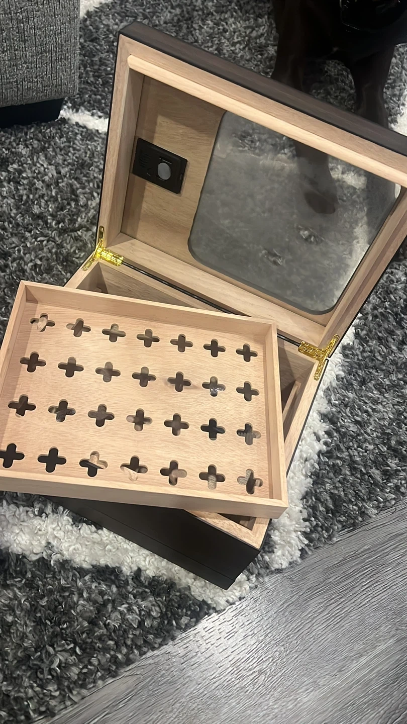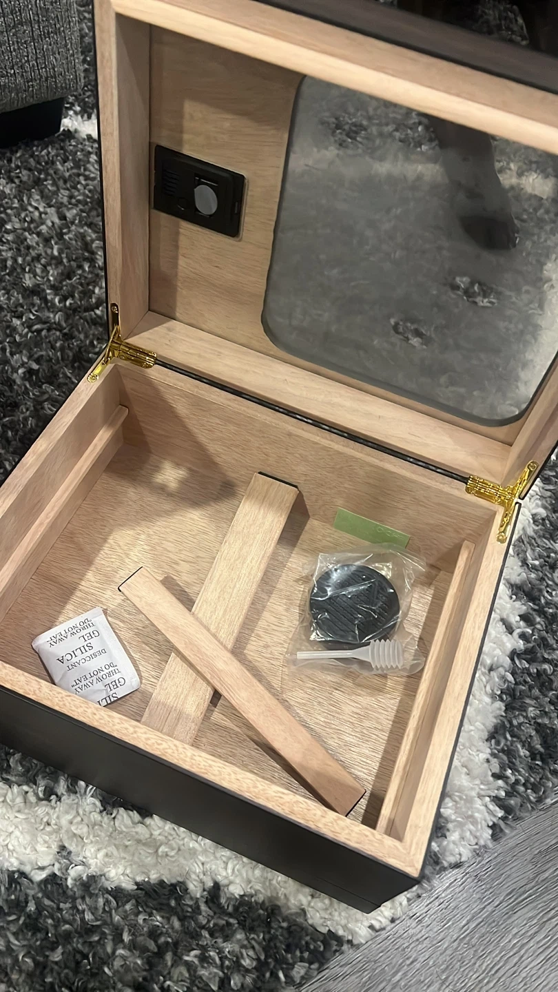 Selling a wooden cigar humidor in great condition as it’s brand new! It comes with all the accessories you need to keep your cigars fresh. The humidor features a built-in hygrometer to monitor humidity levels. It also includes dividers and a humidification device to maintain optimal conditions. Perfect for any cigar aficionado