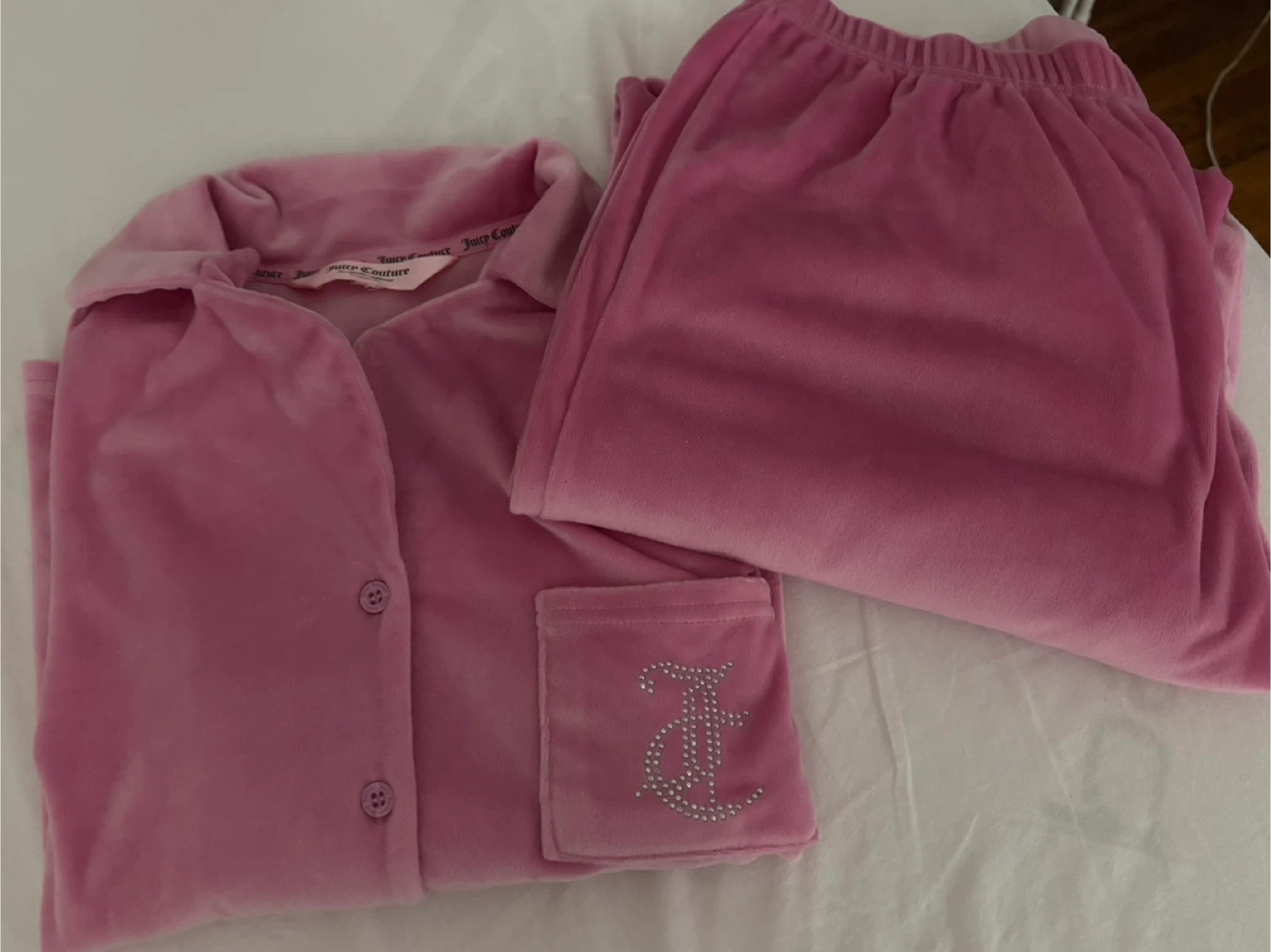 Brand new Cozy pink velour pajama set from Juicy Couture. Features the iconic JC logo with rhinestones on the chest pocket. Button-up top and elastic waist pants for comfort. Soft velour fabric.