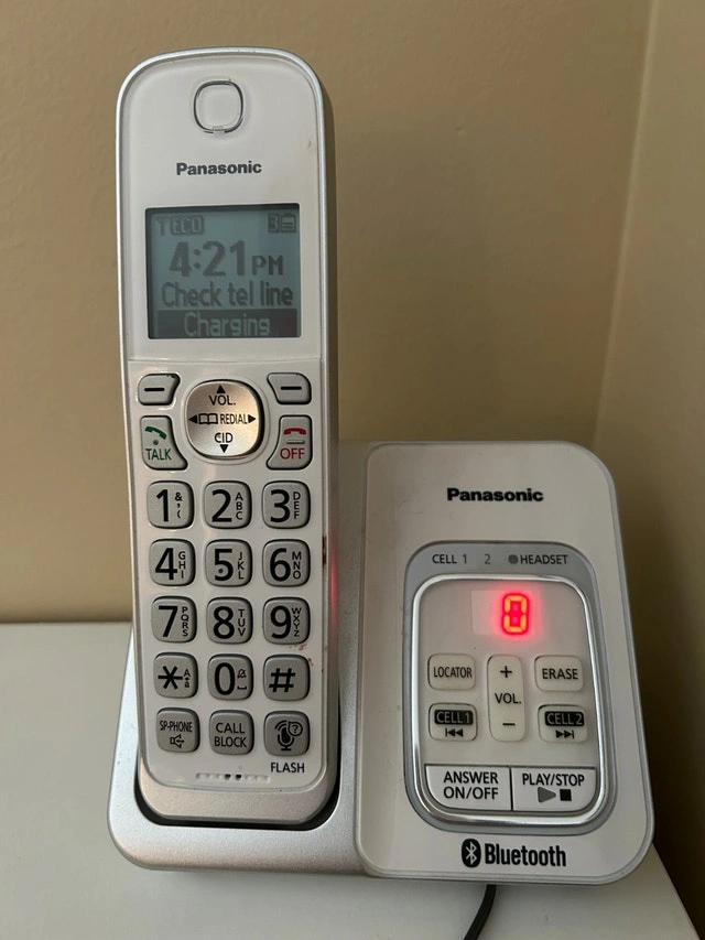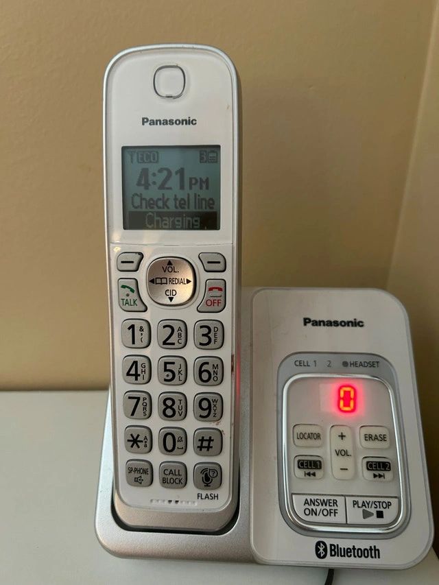 Excellent condition Panasonic cordless phone system. Clear sound, loud ringer, big buttons, very reliable. Panasonic KX-TGDA59C. Works perfectly with cell-to-home adapters so you can use your cell phone instead of paying for a landline. Features Caller ID, Speakerphone, Intercom, and long battery life. Very easy to use. Great for seniors, acreage homes, RVs, cabins, or anyone who cancelled their landline.