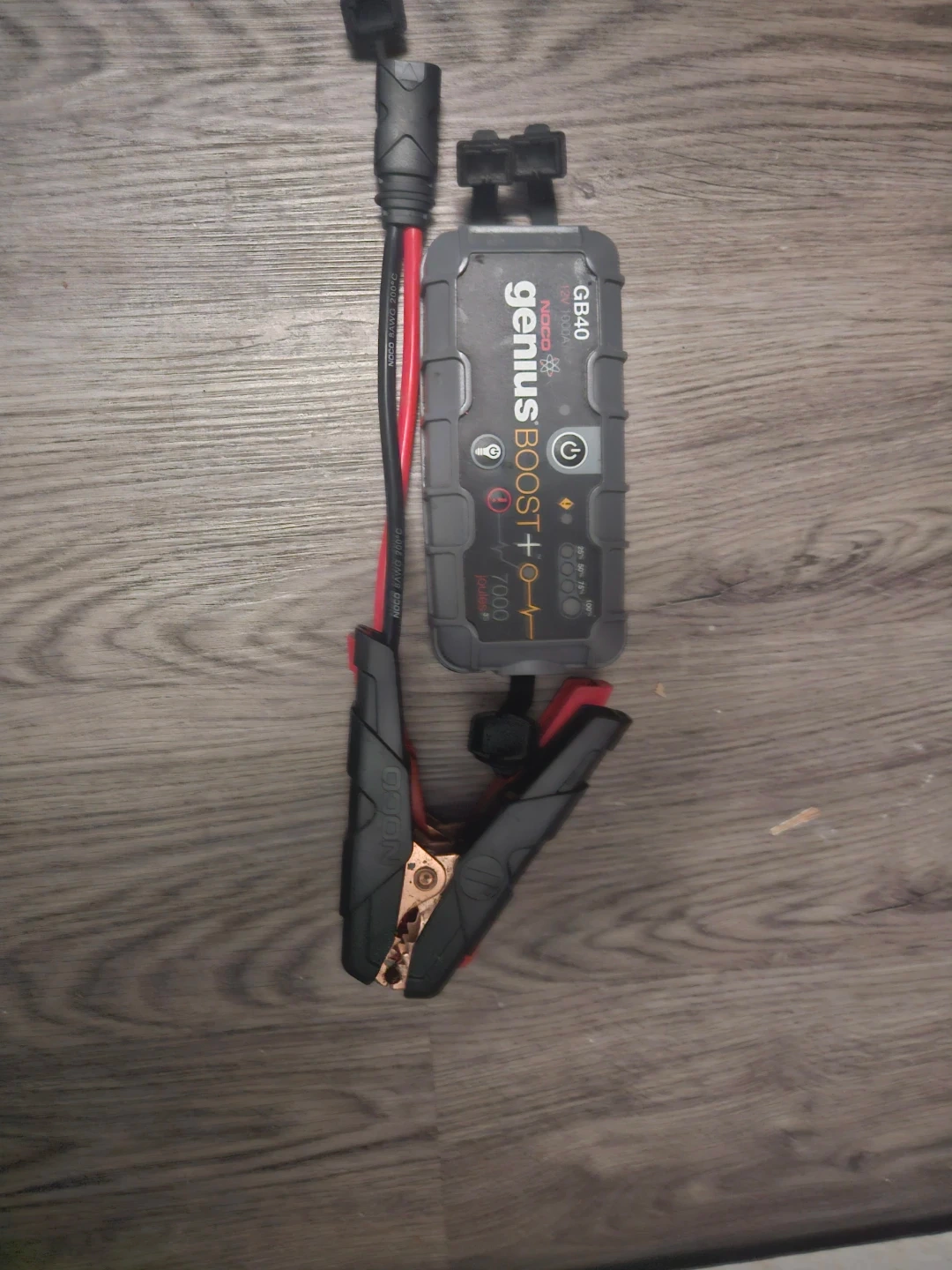 This is a NOCO Genius Boost GB40 jump starter. It provides 7000 joules of starting power. It's suitable for 12-volt vehicles.