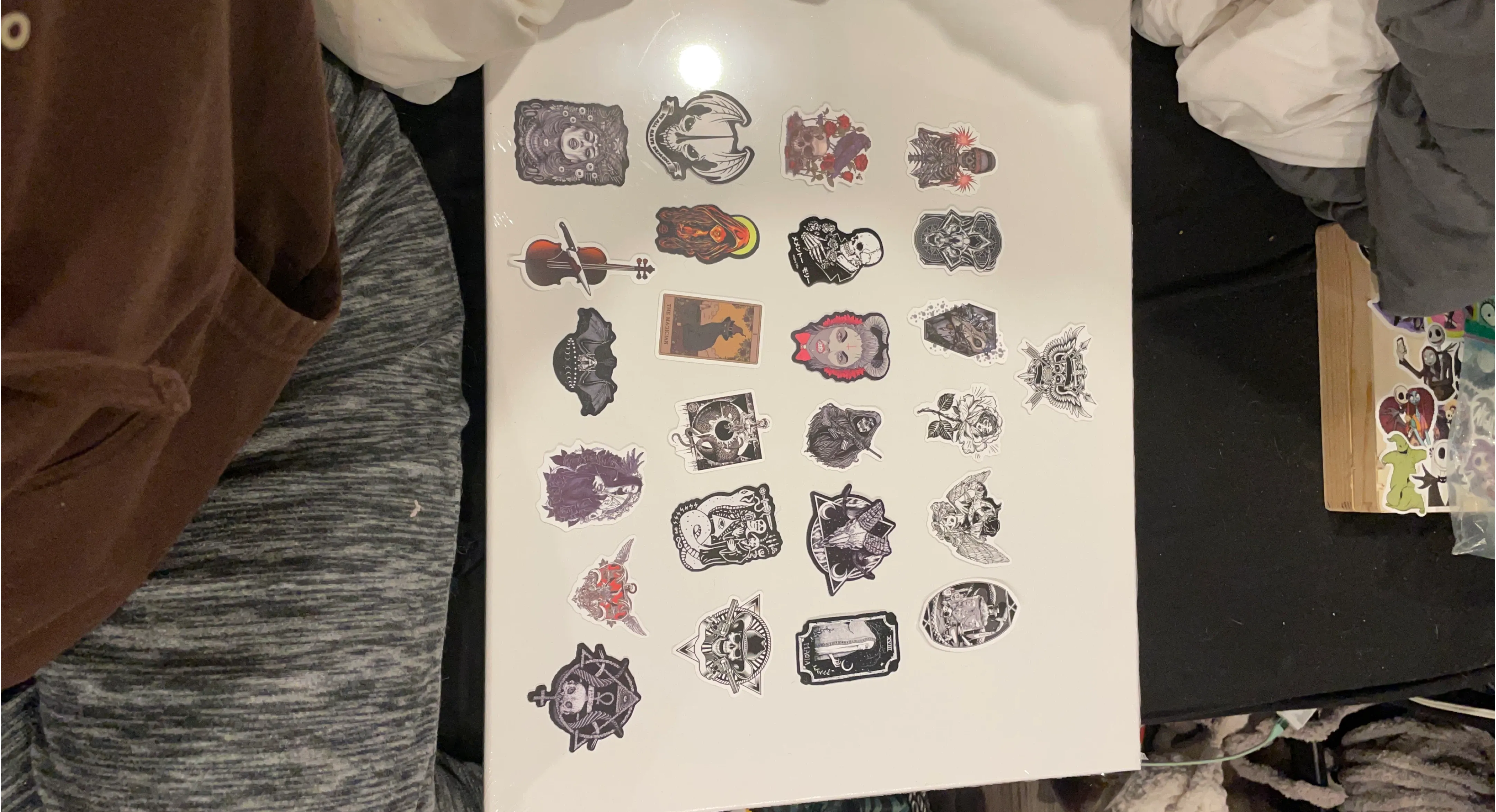 Selling a collection of assorted gothic-themed stickers. They feature various designs including skulls, tarot cards, and other dark imagery. Great for decorating laptops, water bottles, or any other surface you want to add a touch of gothic flair to