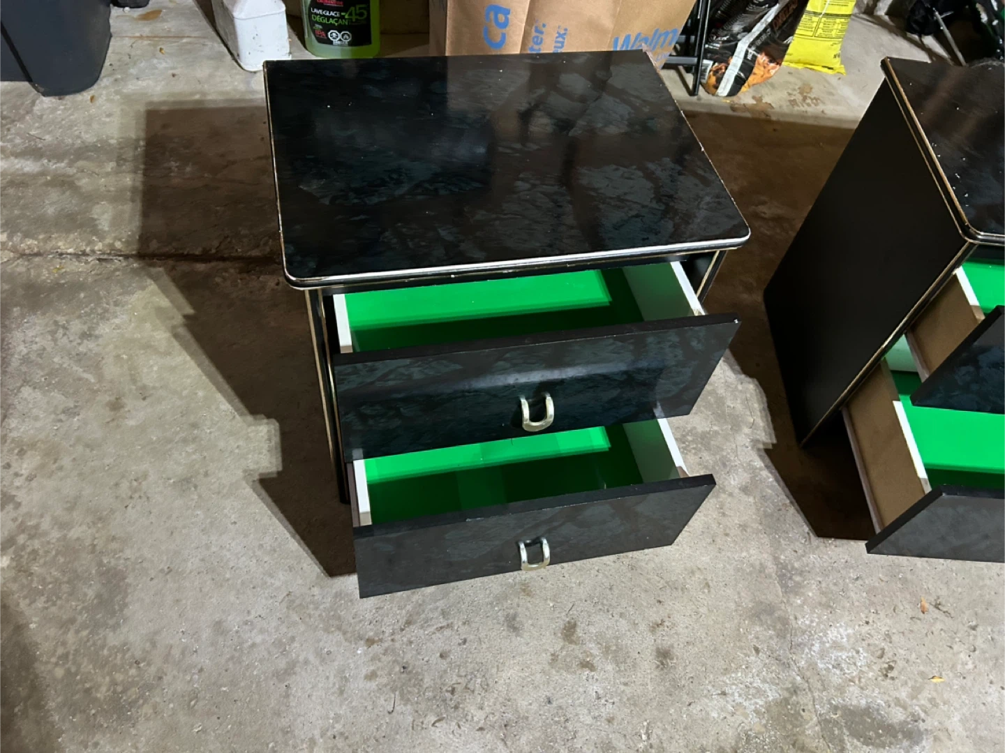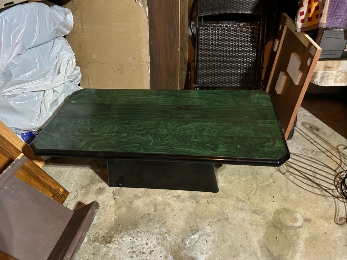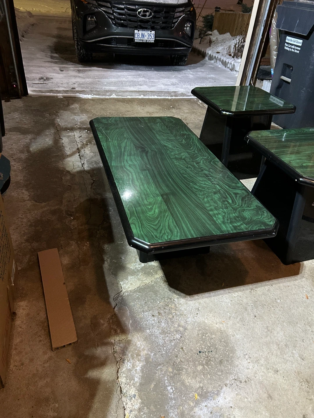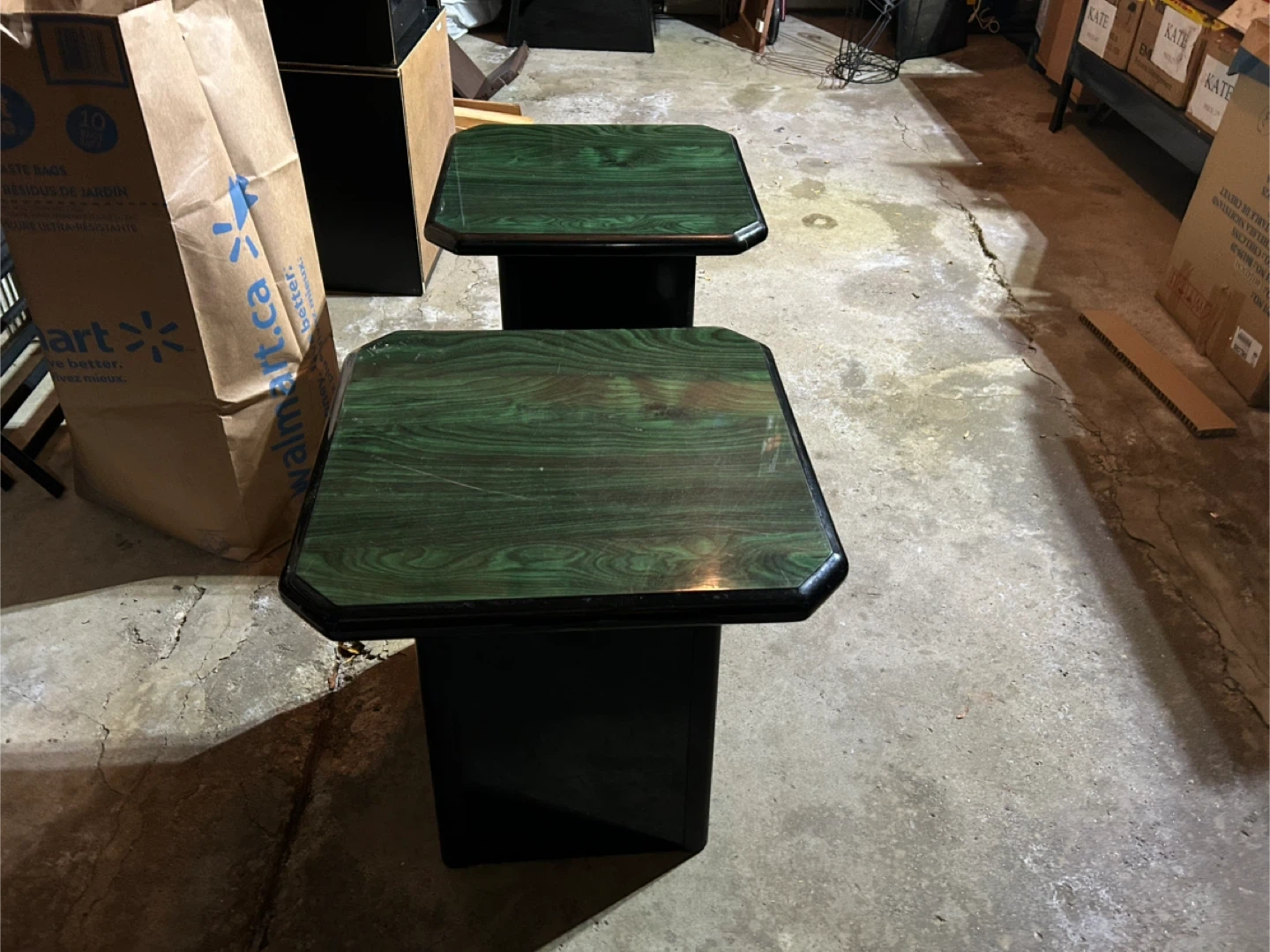 Selling a set of two end tables with a unique green marble-like top and black base. They're in good condition and would add a nice touch to any living room or bedroom. Perfect for lamps, books, or decor!
