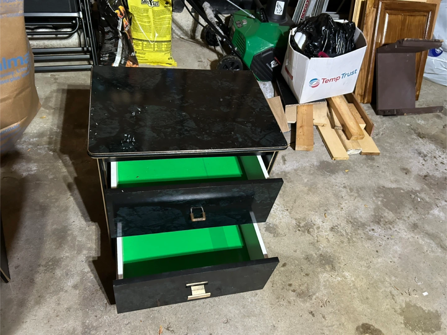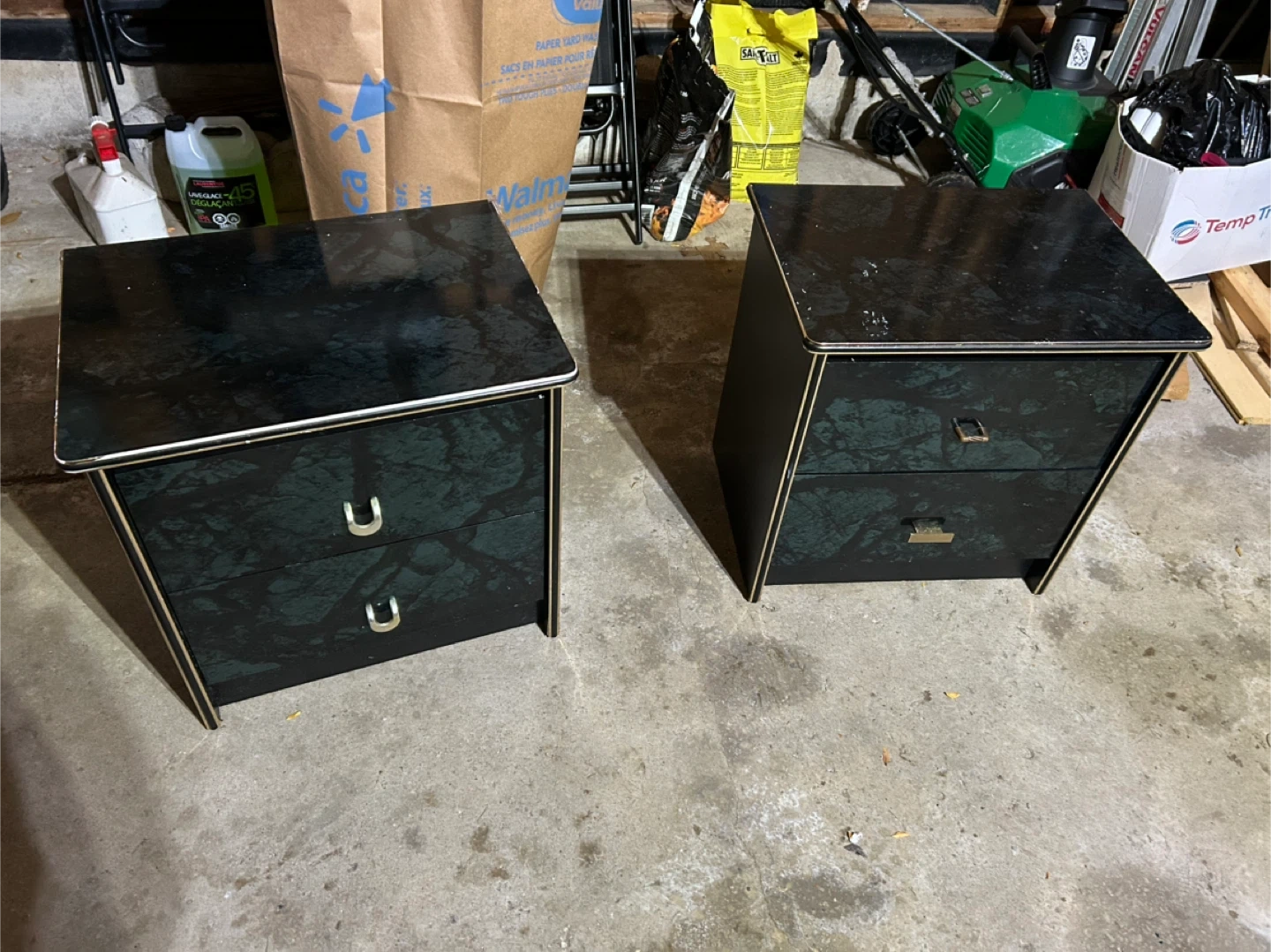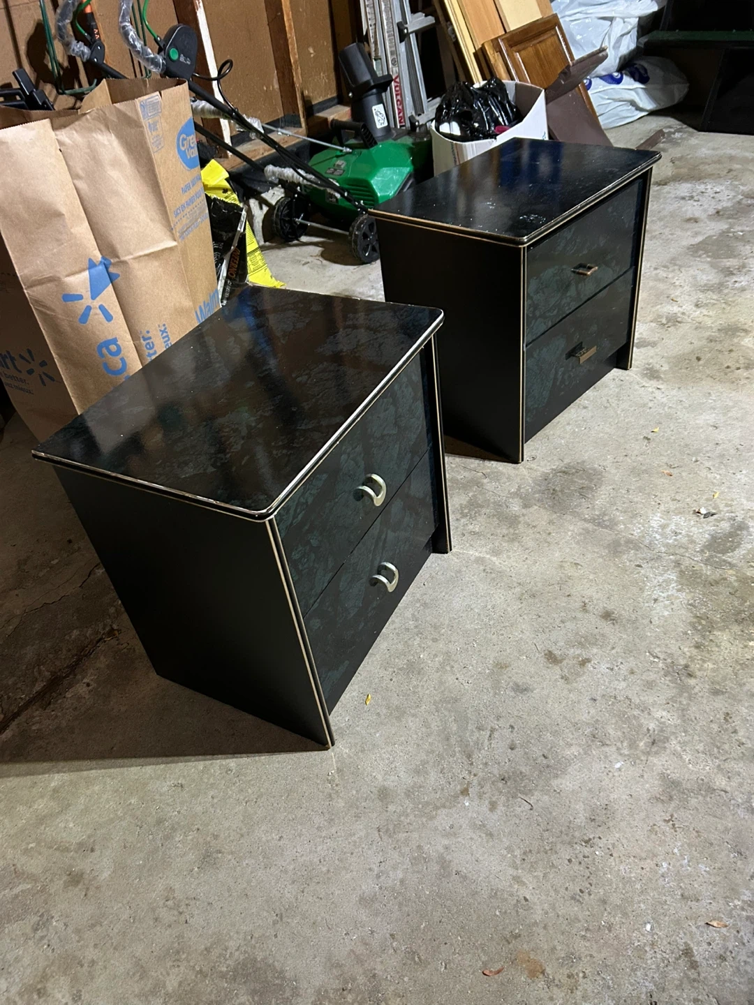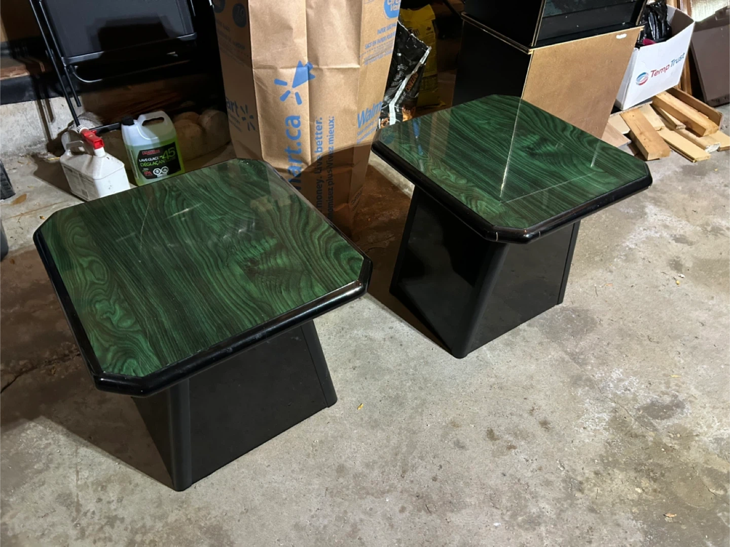 Selling a set of two end tables with a unique green marble-like top and black base. They're in good condition and would add a nice touch to any living room or bedroom. Perfect for lamps, books, or decor!