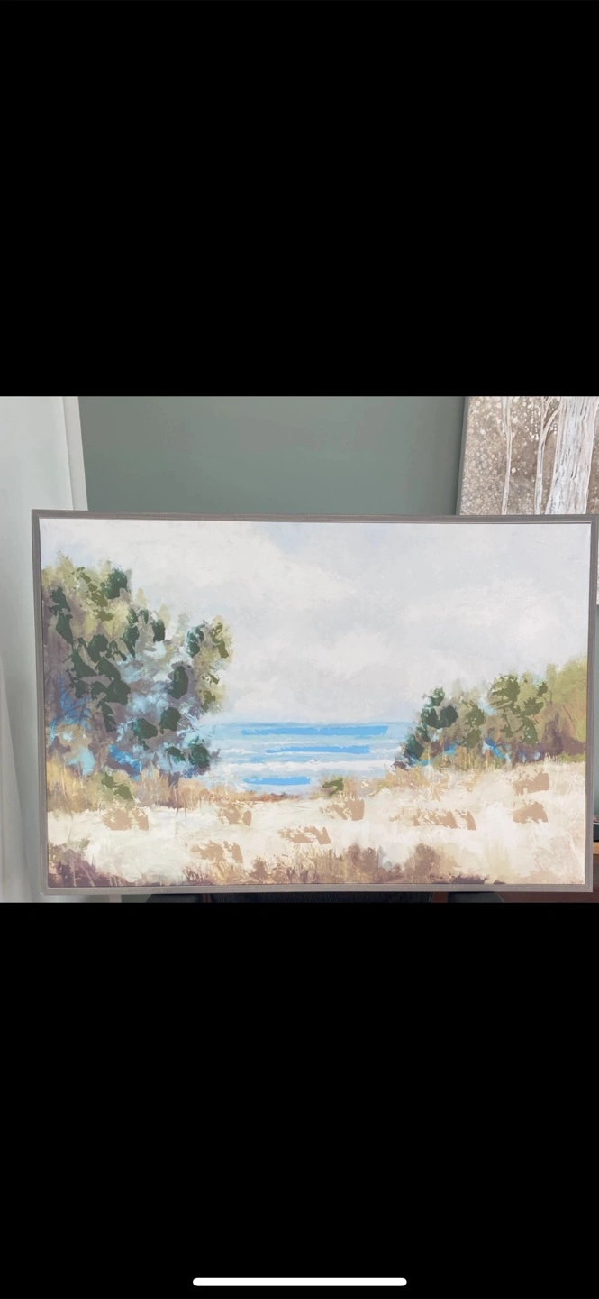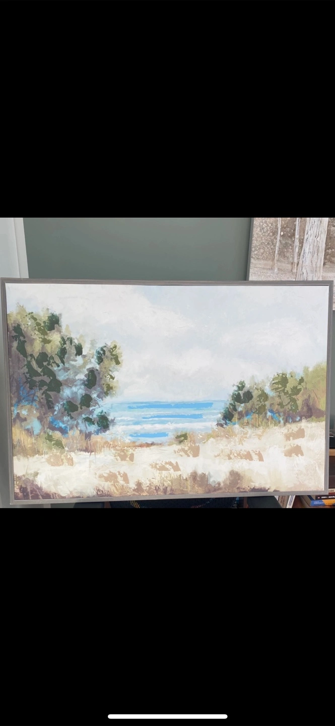 Rectangular framed landscape painting. Depicts a beach scene, with the ocean in the distance. Features lush vegetation and neutral-toned grasses. A painting like this could be a relaxing touch to any home.