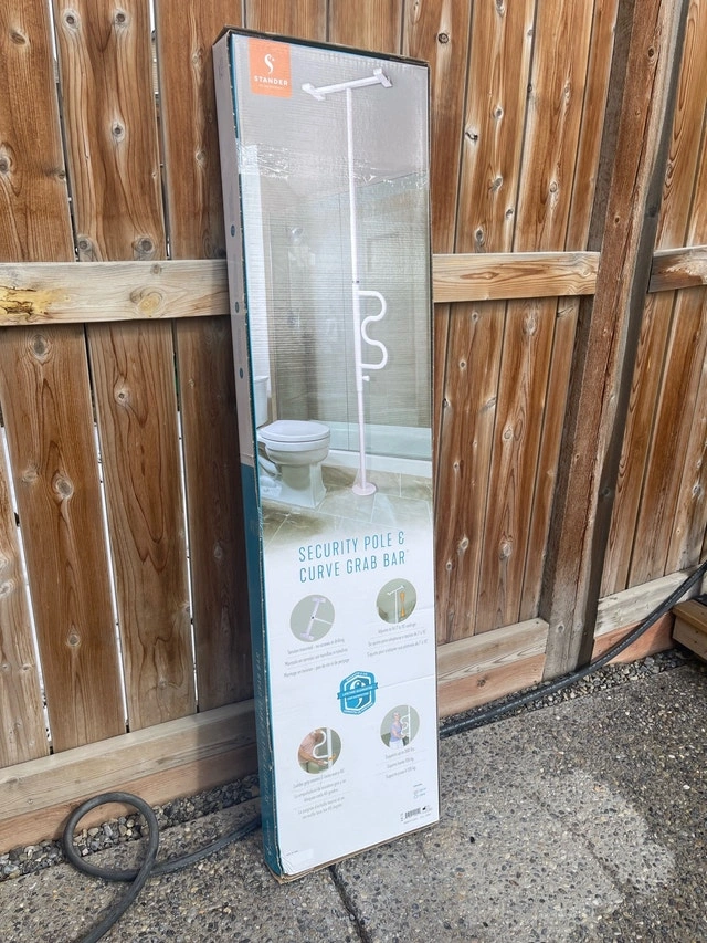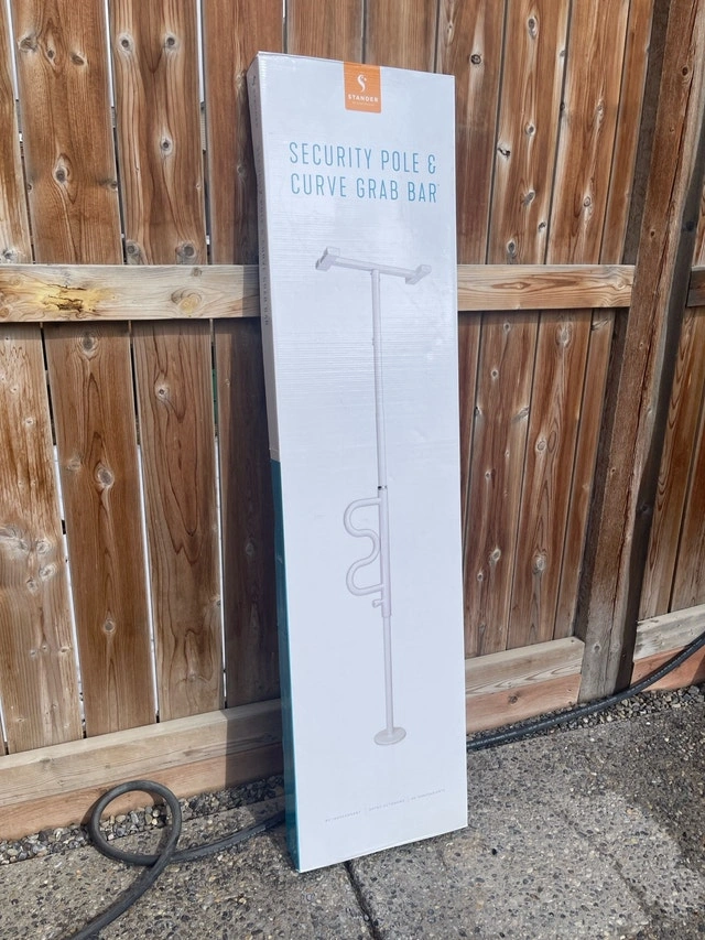 This is a brand new Stander Security Pole and Curve Grab Bar, still in its original packaging. It's designed to provide sturdy support where you need it most, perfect for assisting with standing, sitting, or transferring. This pole offers a reliable grip and added safety in any room. It provides assistance with standing and sitting, offers a secure and comfortable grip, is easy to install, and is portable and compact. This security pole is ready to assist you. If the ad is up, it's available!