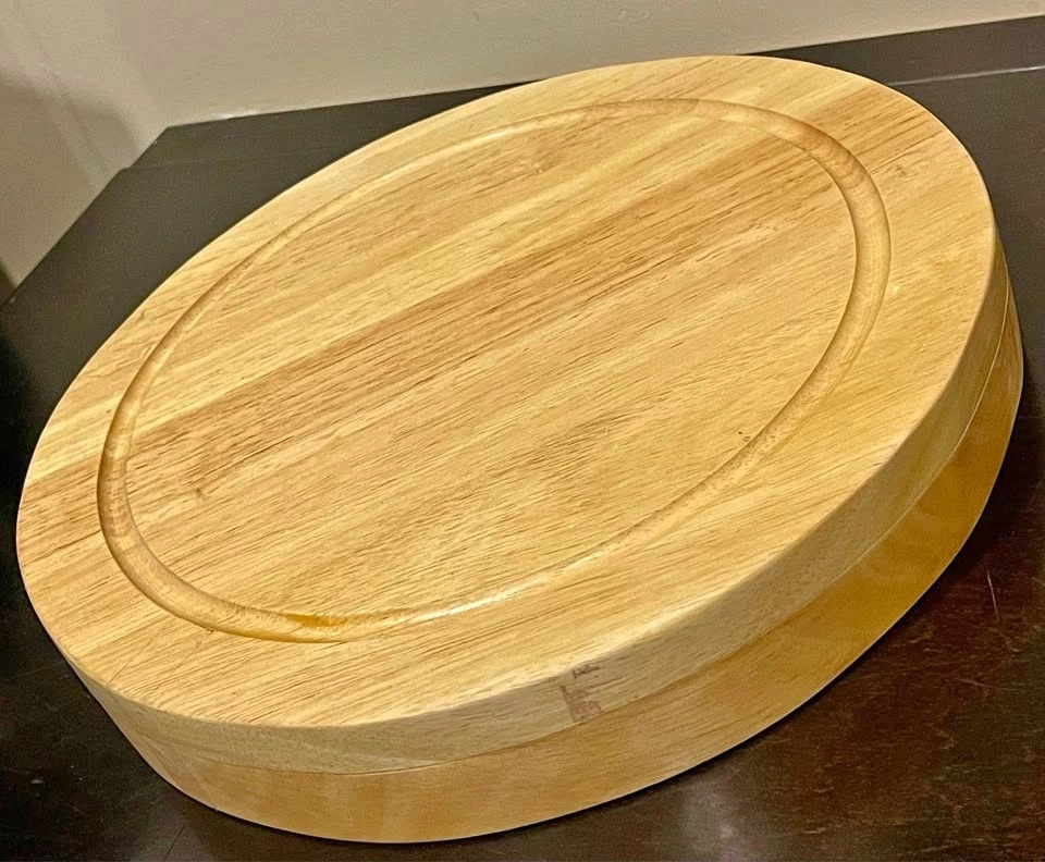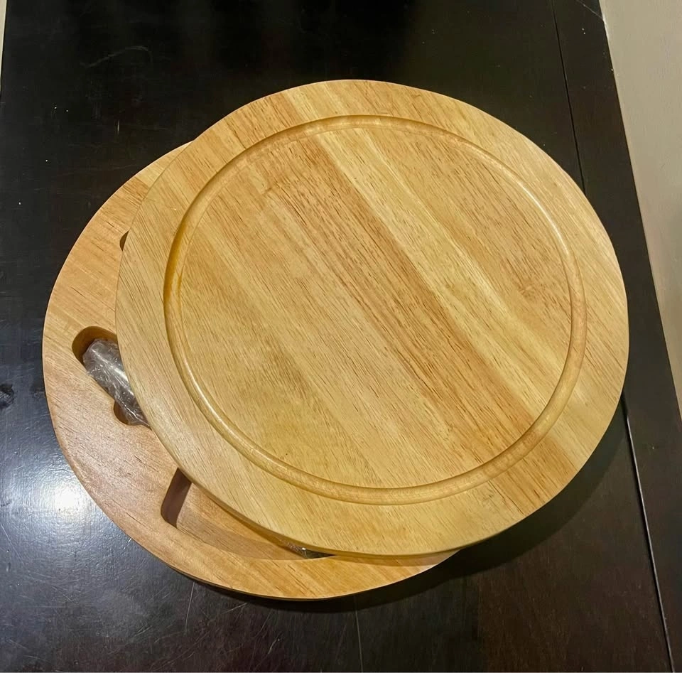 Porch pickup Eglinton and Dufferin. Bamboo Cheese Board and Knife Set – Swiveling Charcuterie Board with Slide-Out Drawer – Serving Platter for Cheese | Round Serving Tray | Wood Cheese Board Set | Housewarming Gift Idea. 12 1/2”. New, never used, comes with utensil.