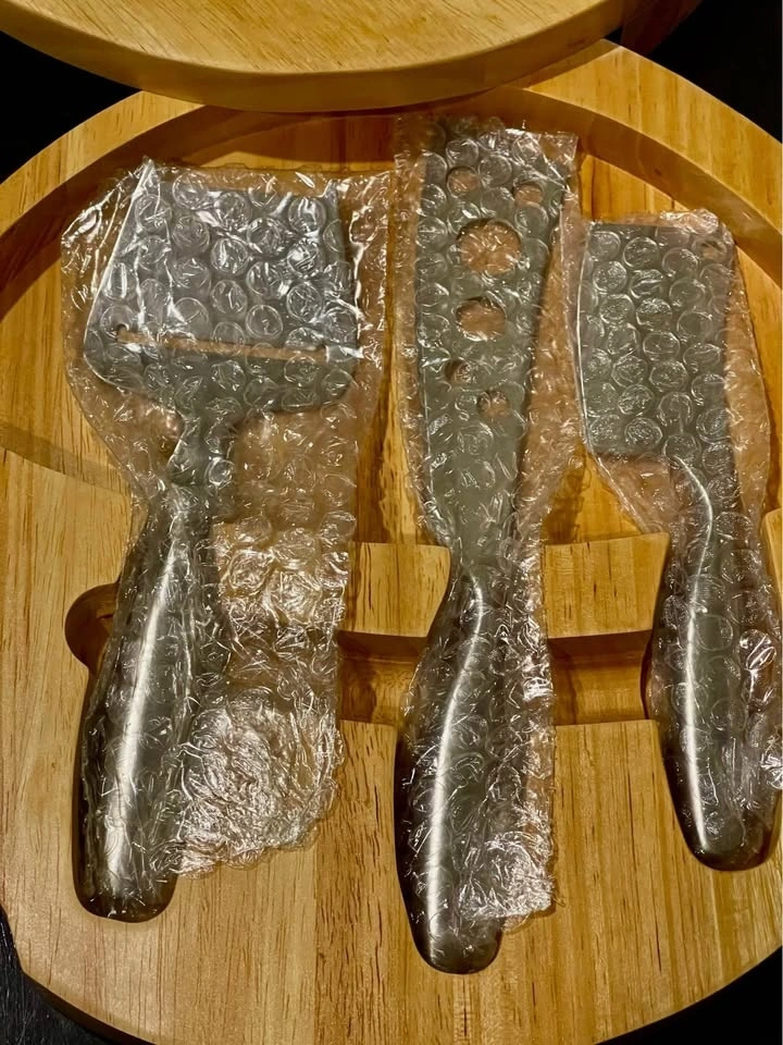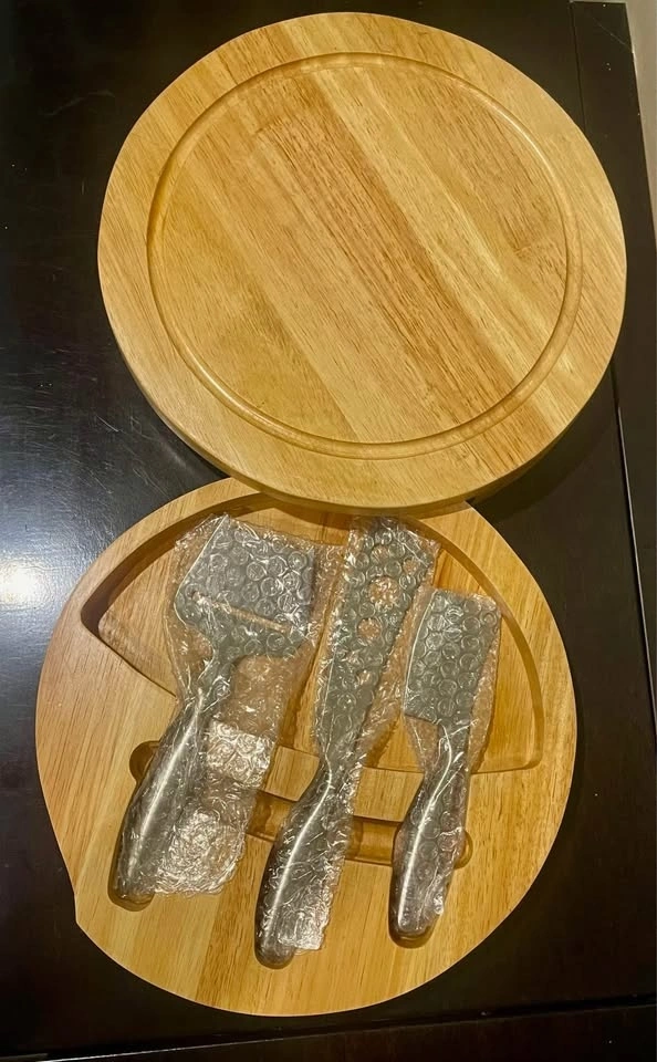 Porch pickup Eglinton and Dufferin. Bamboo Cheese Board and Knife Set – Swiveling Charcuterie Board with Slide-Out Drawer – Serving Platter for Cheese | Round Serving Tray | Wood Cheese Board Set | Housewarming Gift Idea. 12 1/2”. New, never used, comes with utensil.