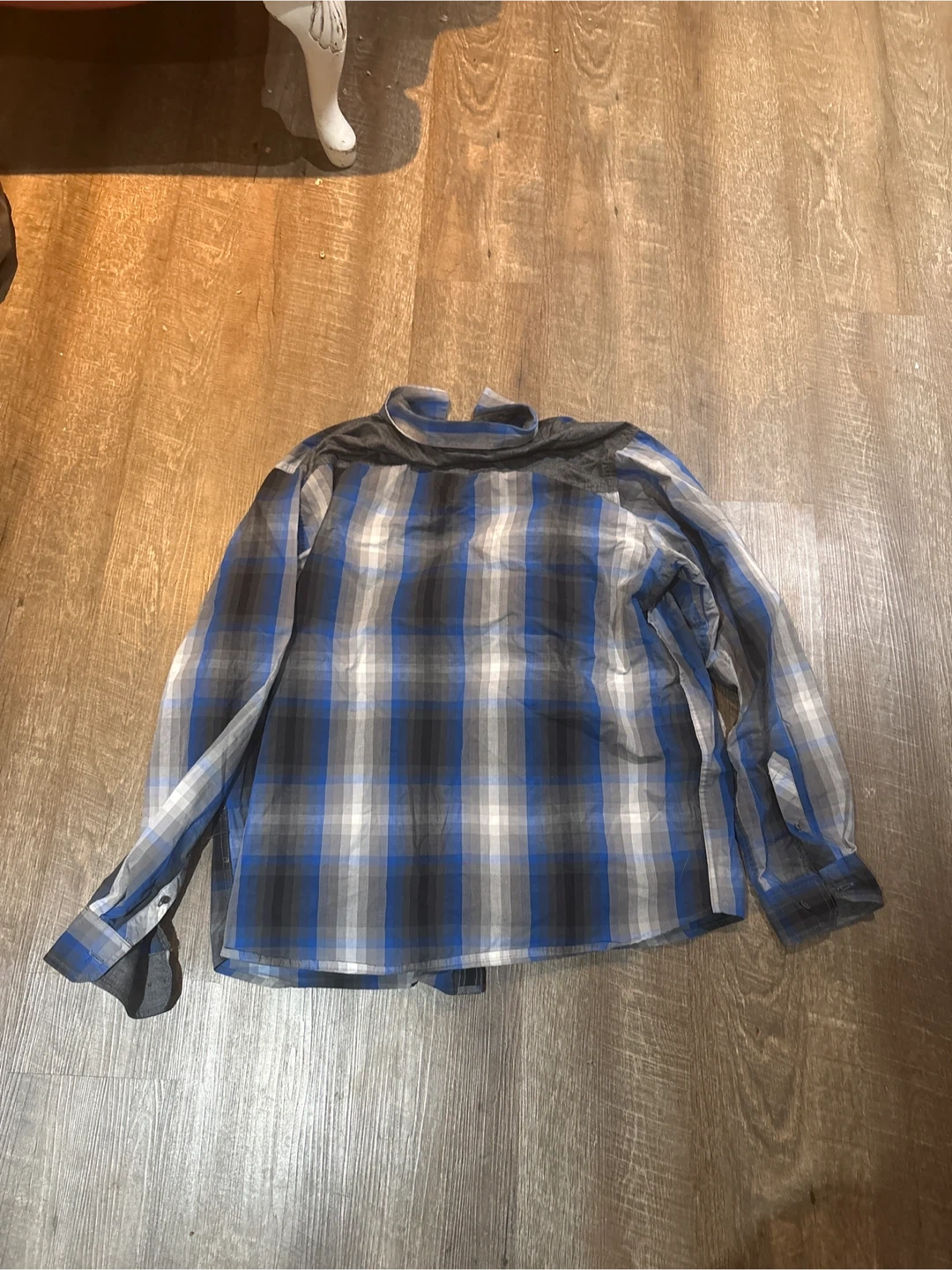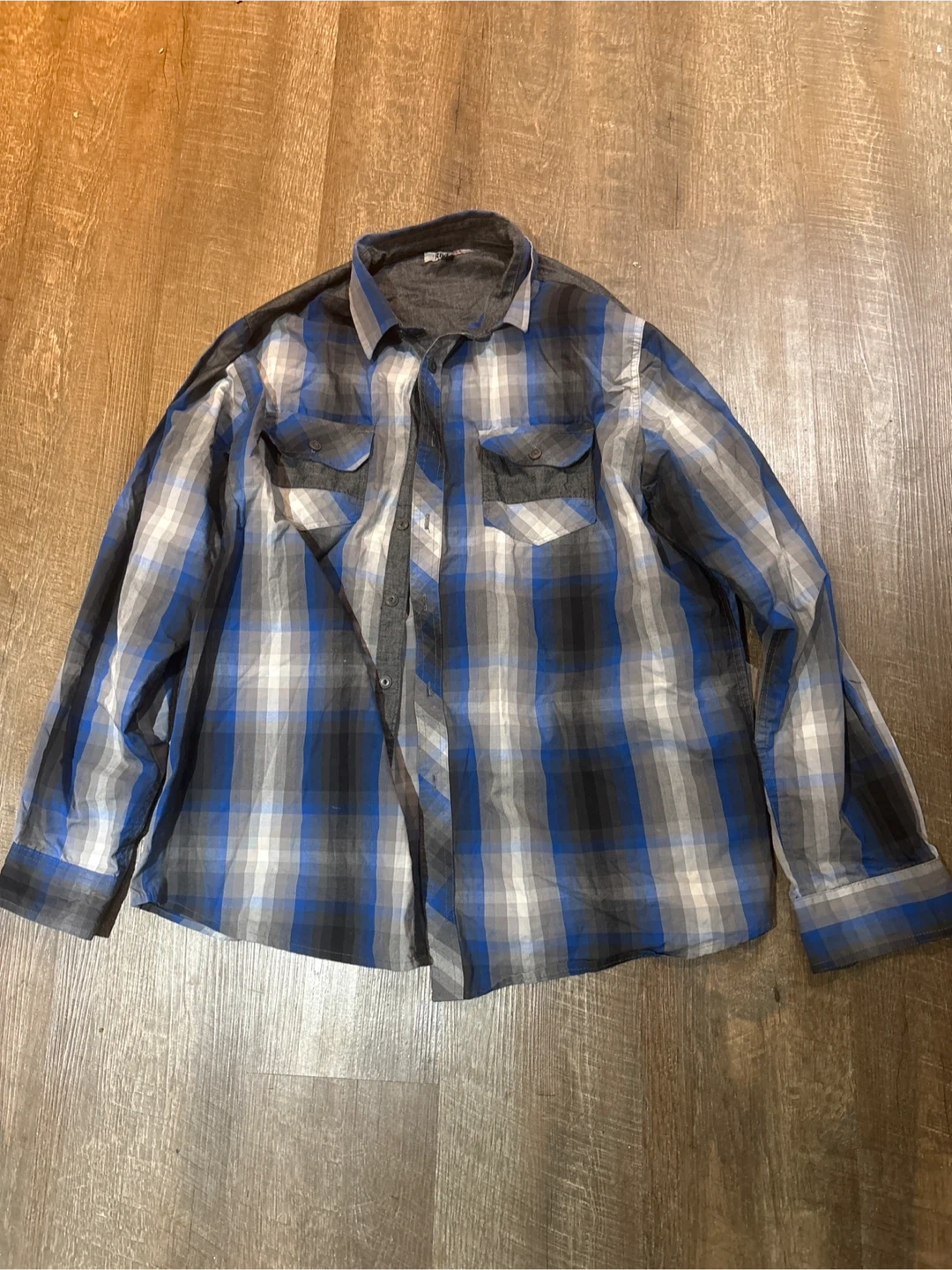 Classic plaid long sleeve button-up shirt with two chest pockets. Button-up front and cuffs. It's made from a comfortable blend of materials. This shirt is great for casual wear.