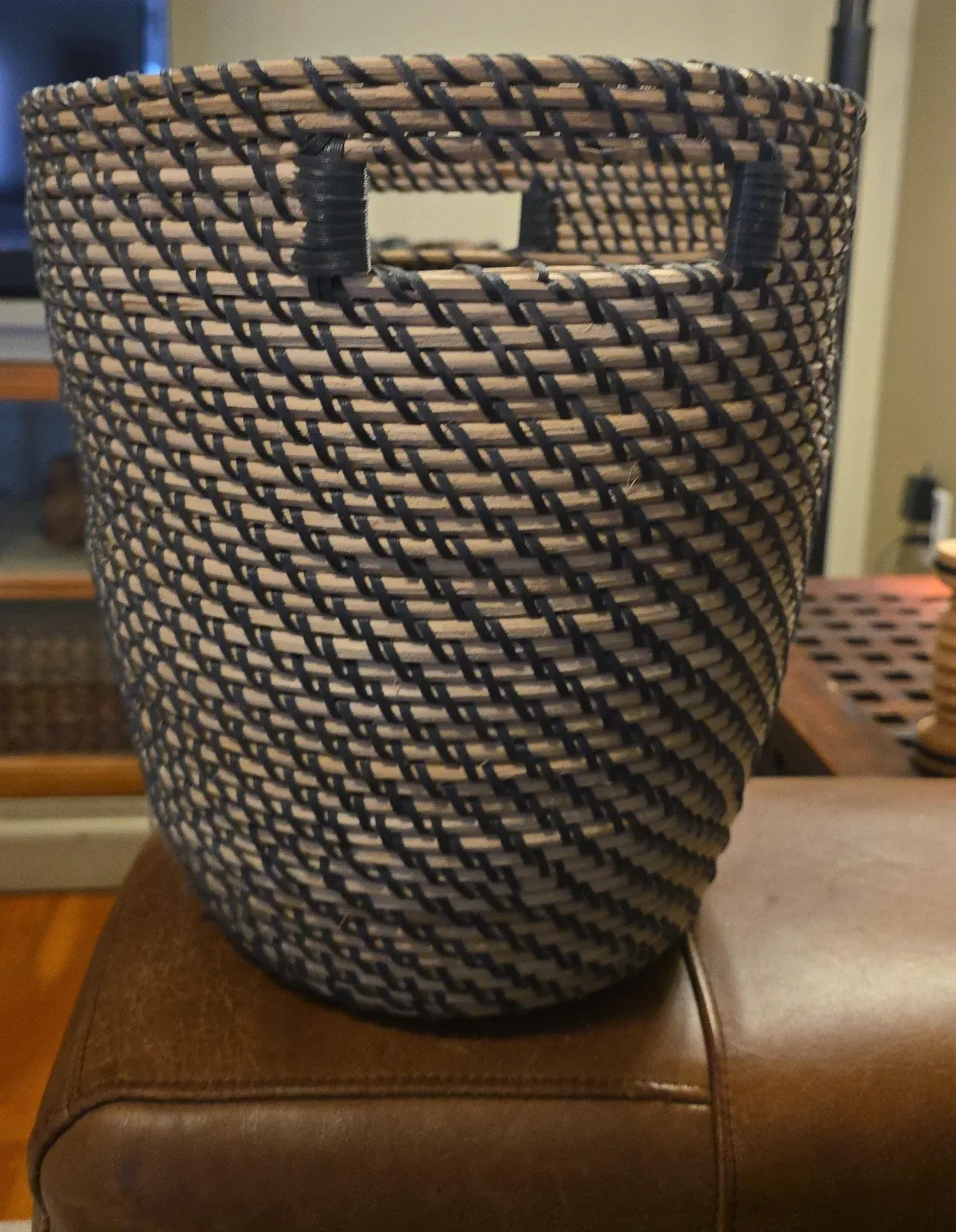 This woven basket is made from natural materials with dark accents. It features cut-out handles for easy carrying. It's a handy size for organizing small items.
