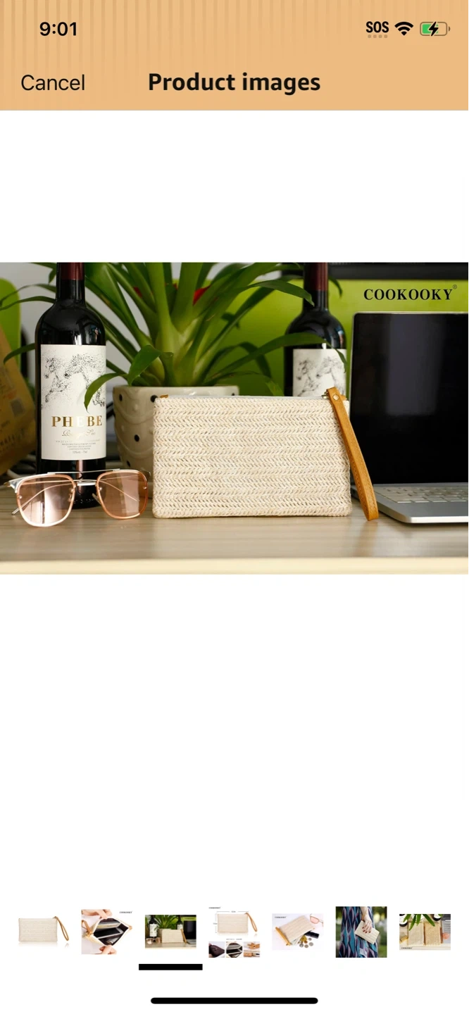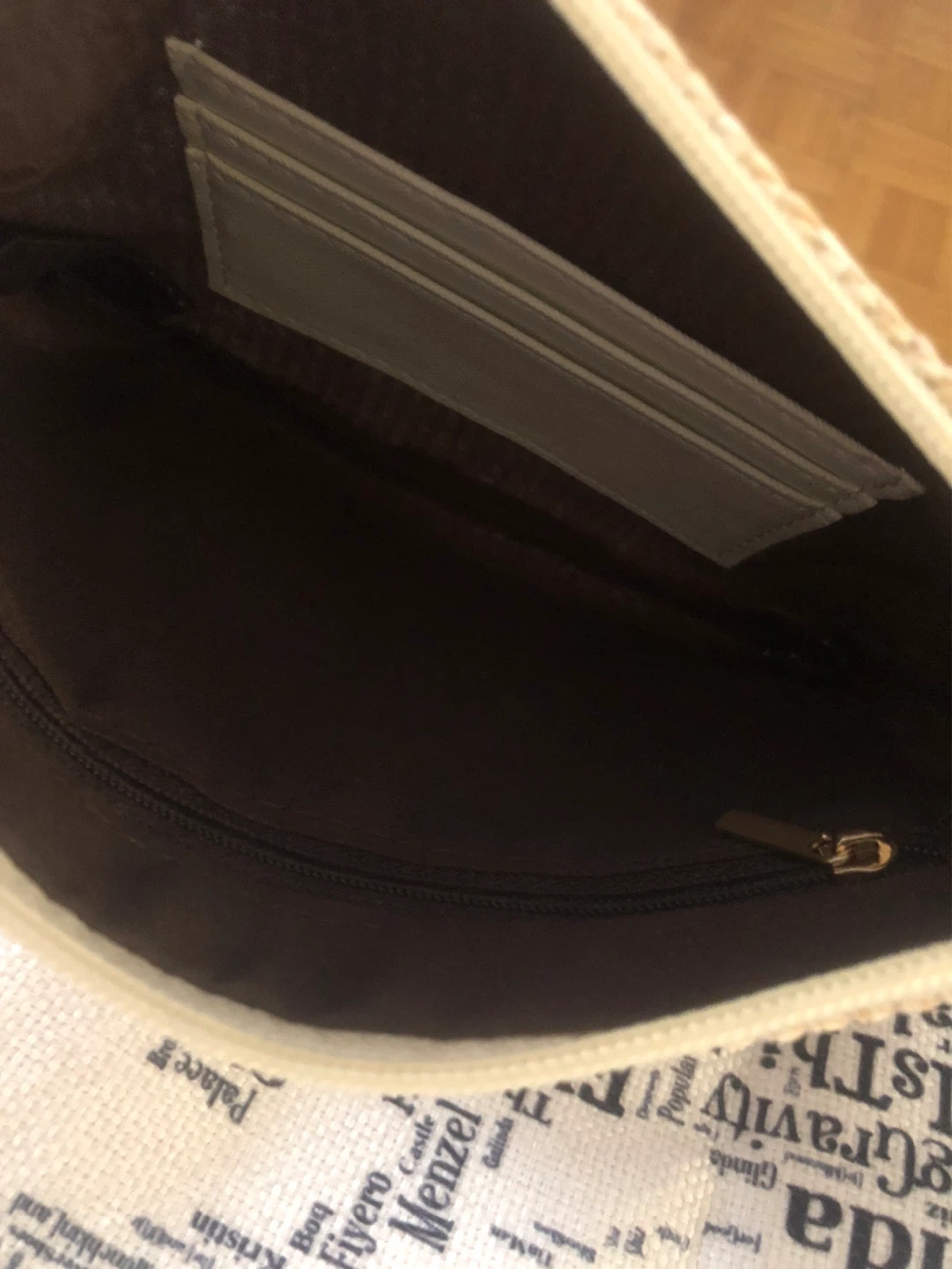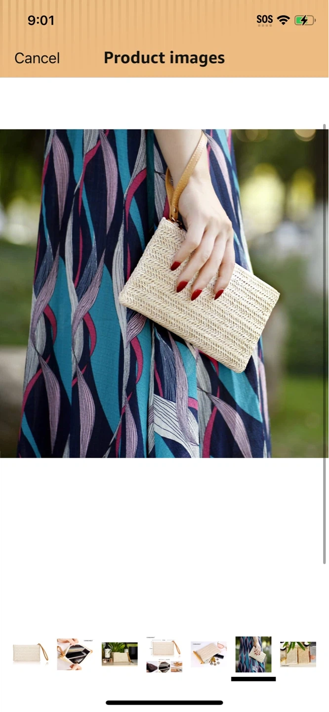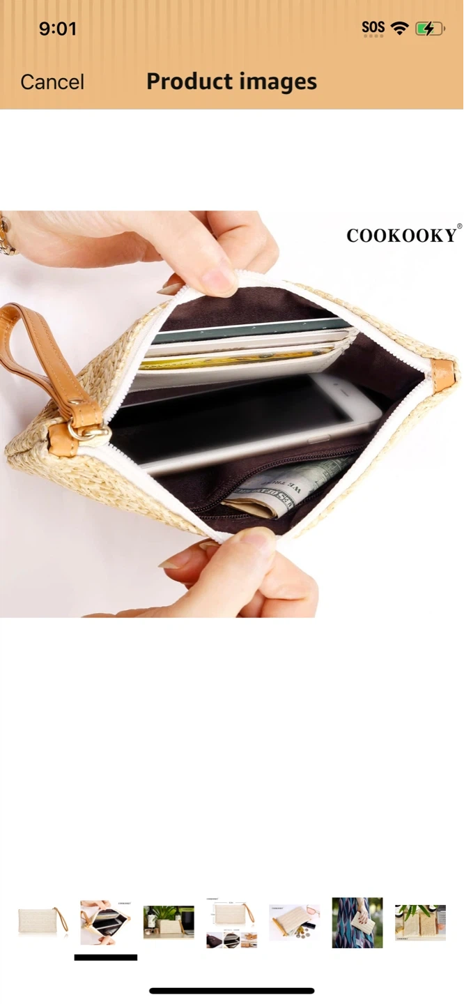 This new clutch is made from woven straw material. It measures 8.3 inches wide by 5.5 inches tall. It's perfect for carrying essentials like your phone, cards, and cash.