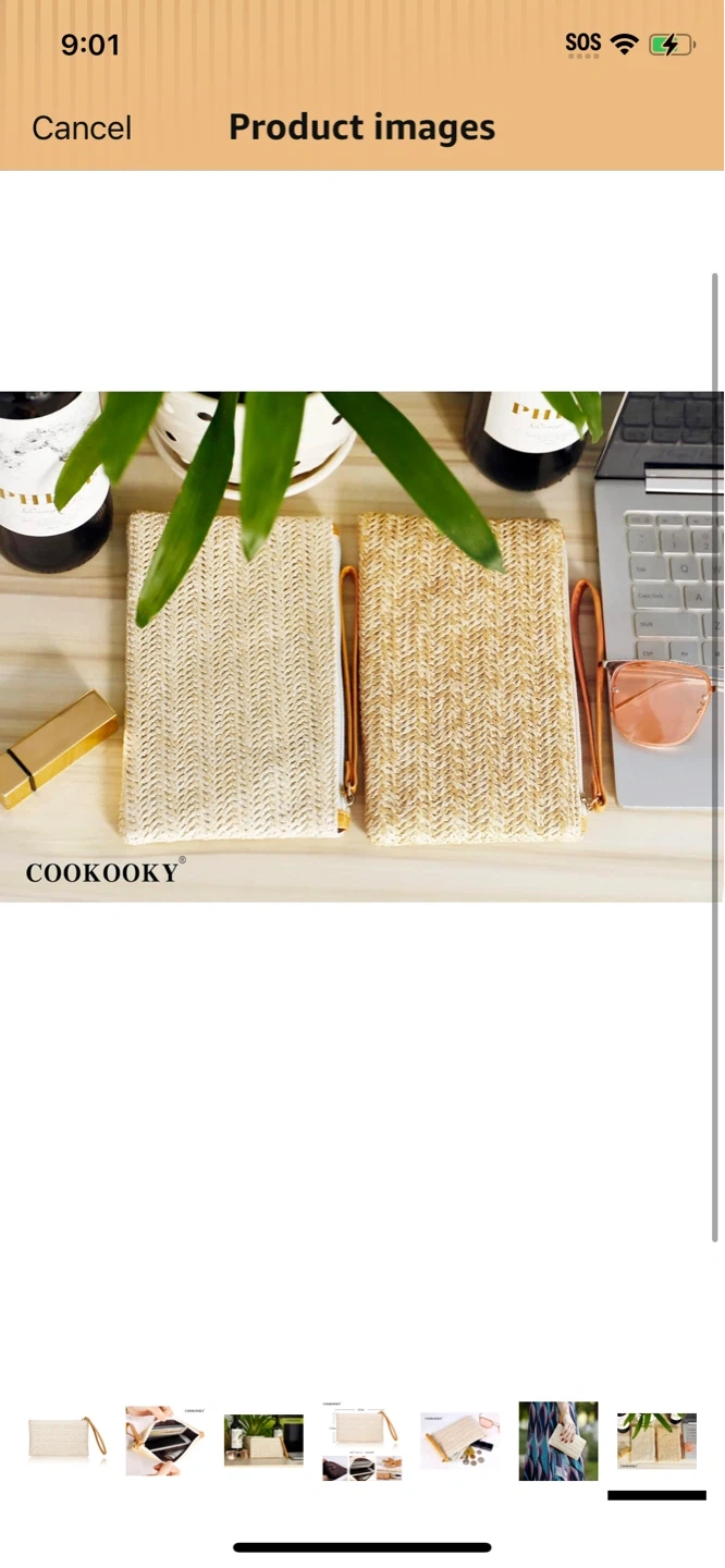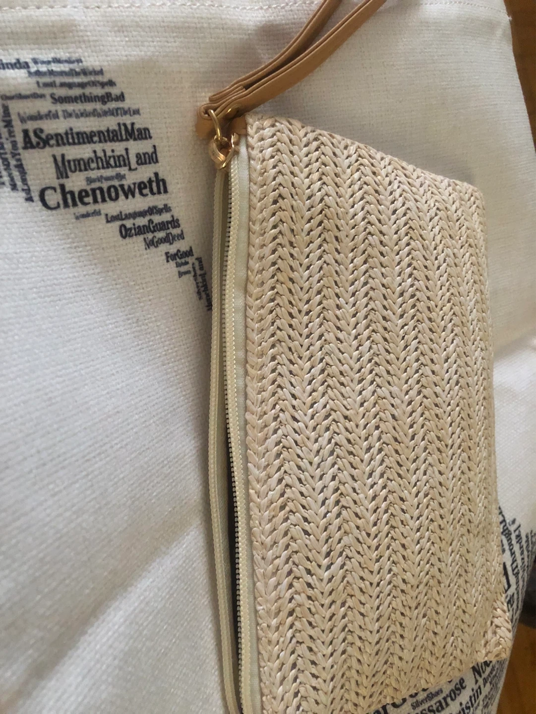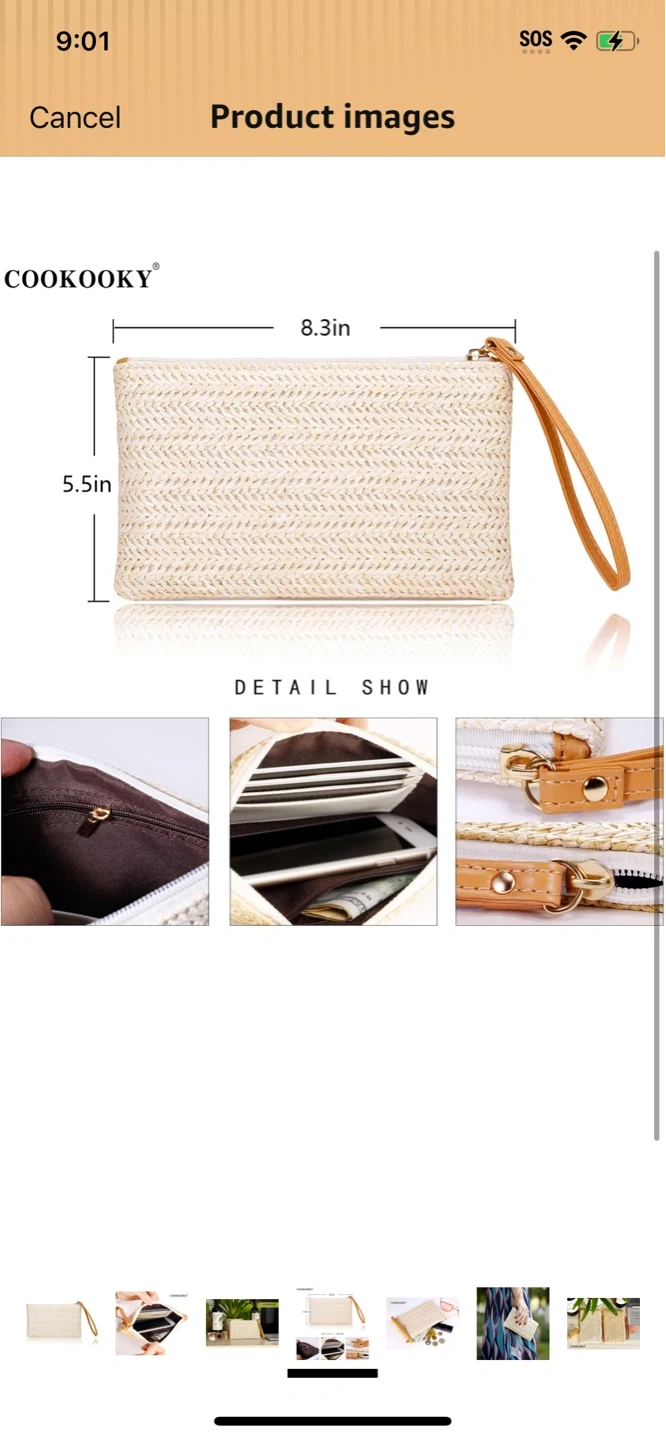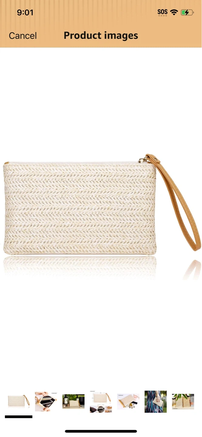 This new clutch is made from woven straw material. It measures 8.3 inches wide by 5.5 inches tall. It's perfect for carrying essentials like your phone, cards, and cash.