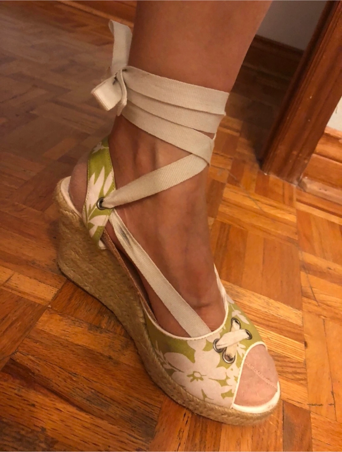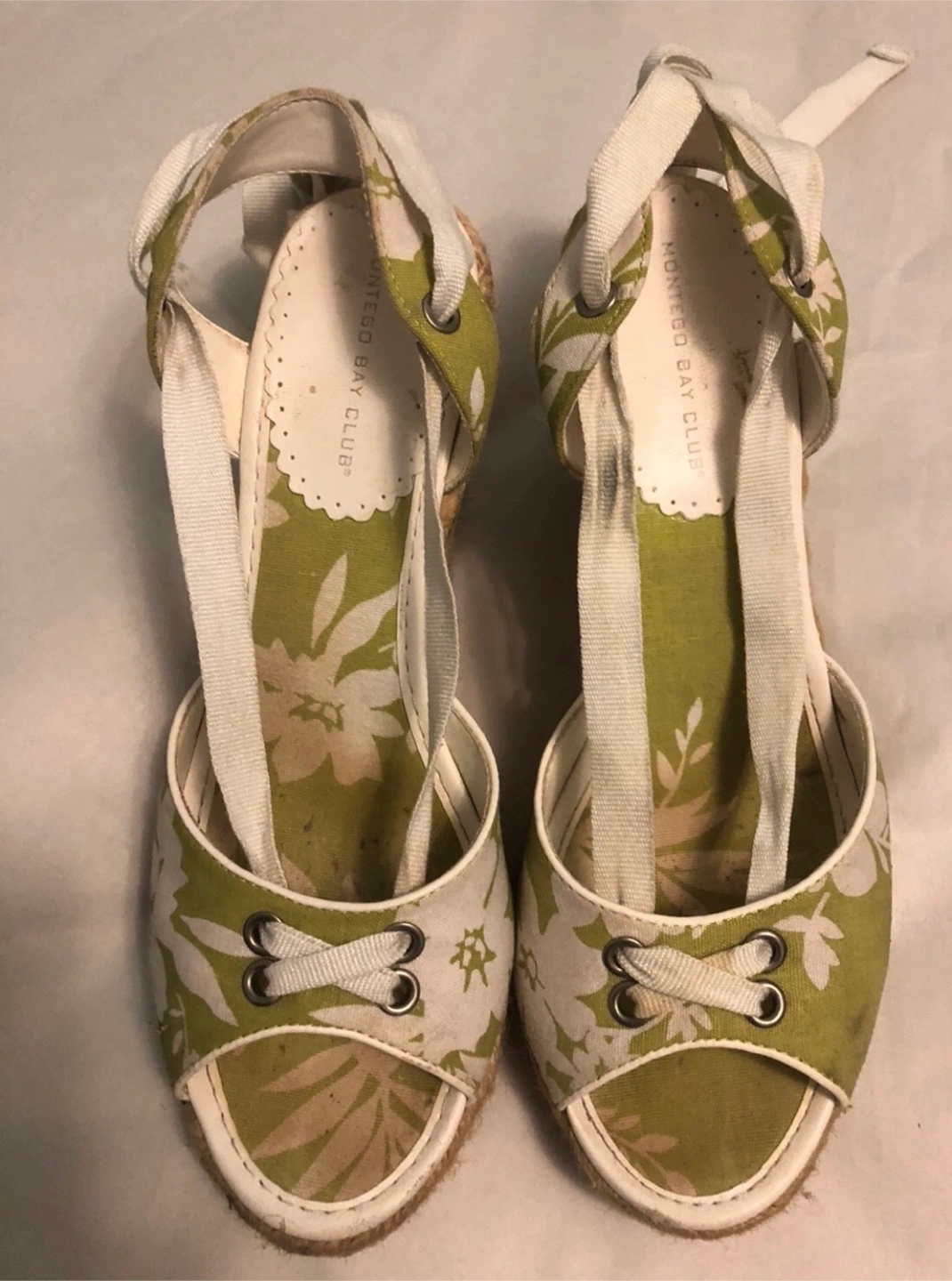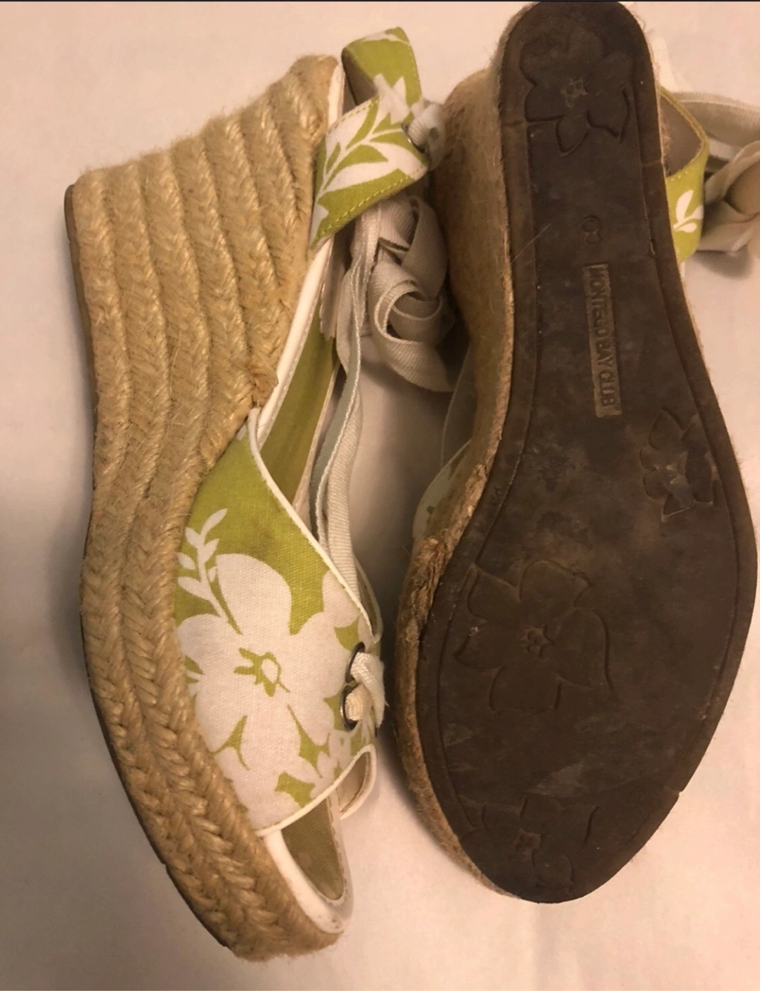 Cute espadrille wedge sandals from Monterey Bay Club! They have a fun floral pattern and tie around the ankle. Size 8.