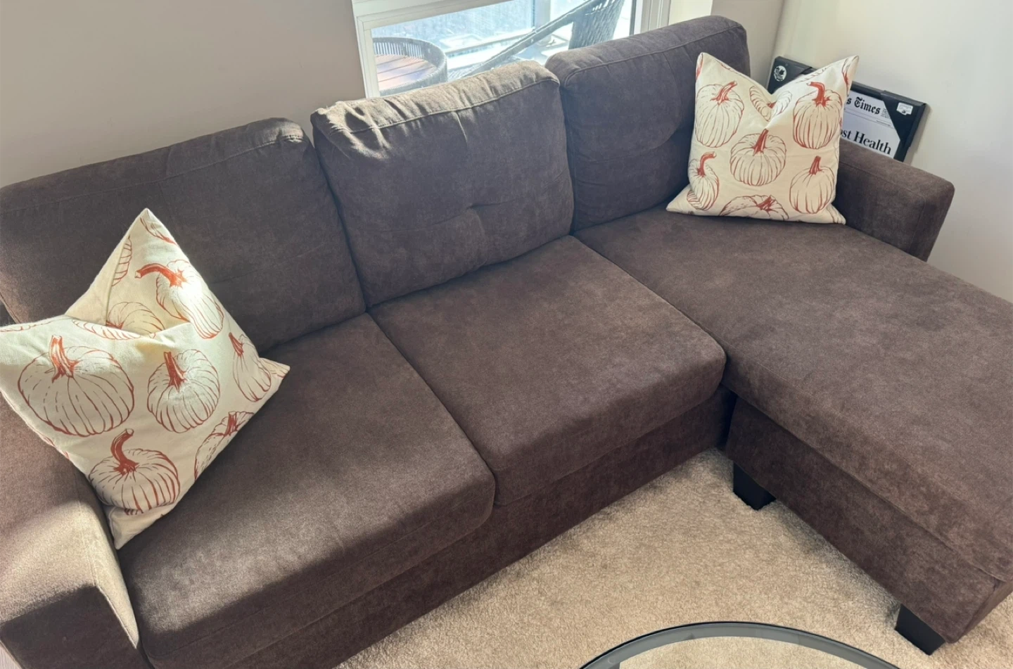 Selling a comfortable brown sectional sofa. It's in great condition and ready for a new home! No rips, No Stains, Pet-free! Perfect for lounging and adding a touch of warmth to your living space.