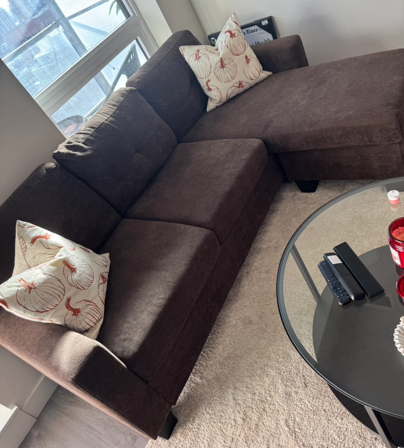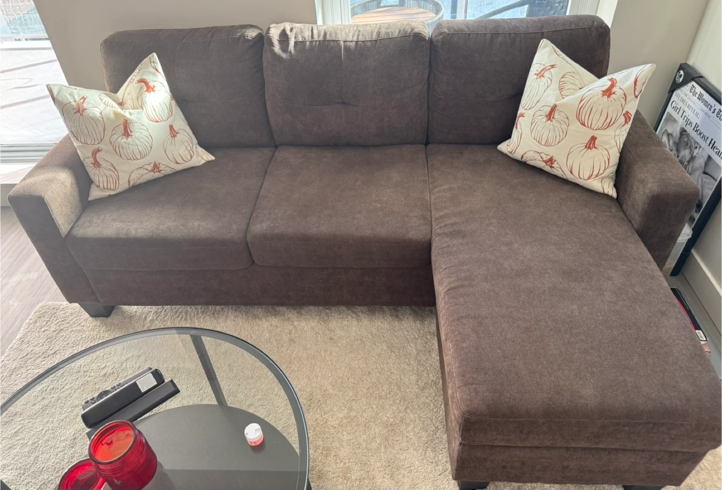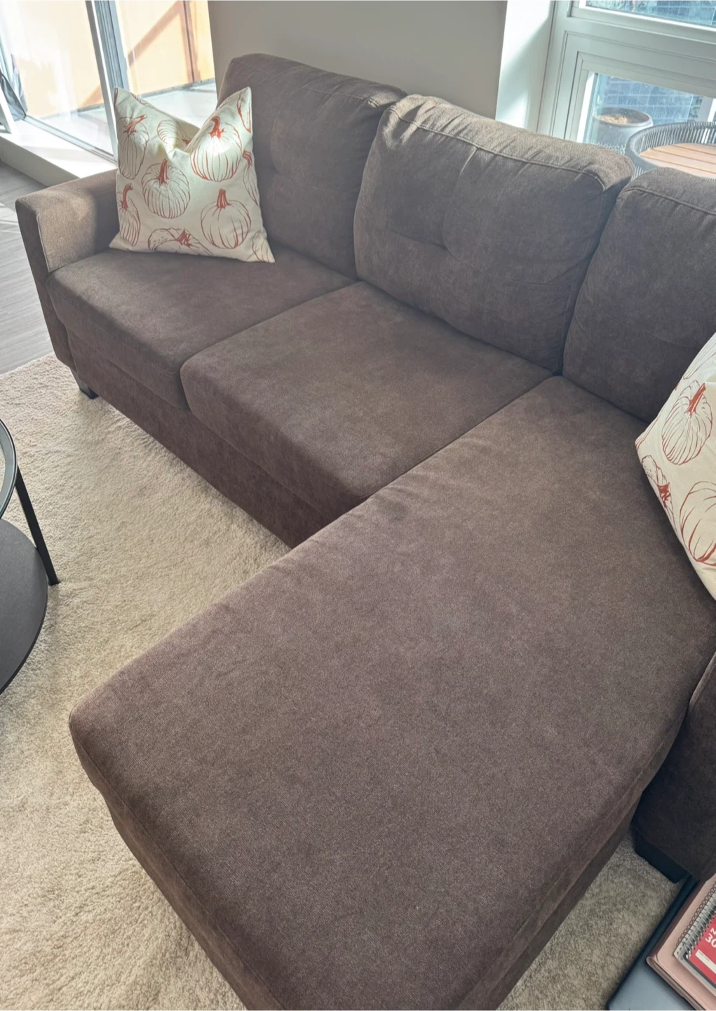 Selling a comfortable brown sectional sofa. It's in great condition and ready for a new home! No rips, No Stains, Pet-free! Perfect for lounging and adding a touch of warmth to your living space.