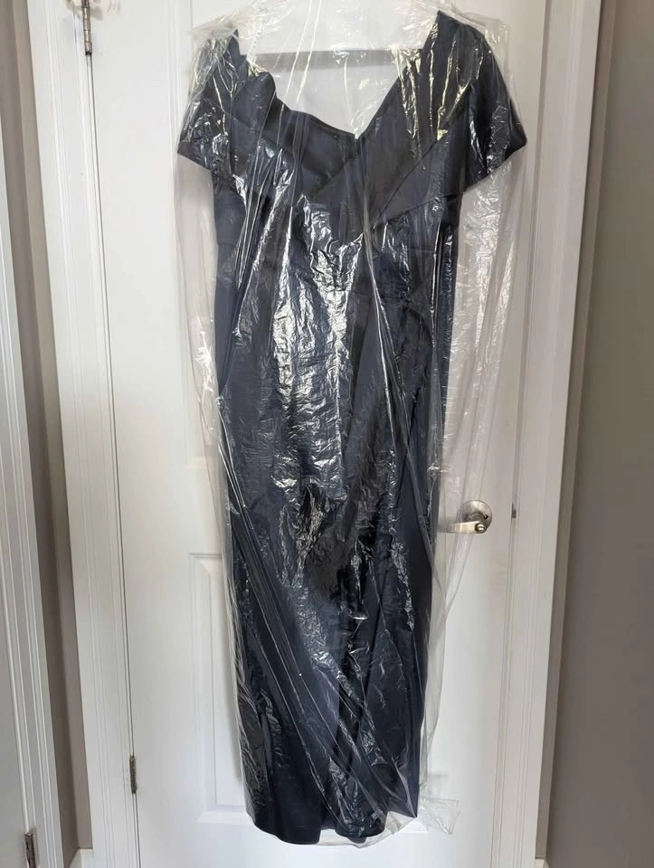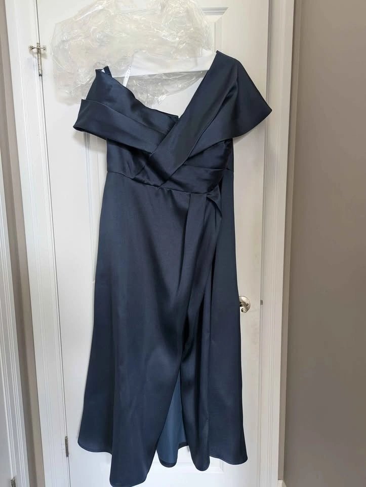 Beautiful navy blue gown worn once and now freshly dry-cleaned. No stains no rips. Perfect condition. Size 20. No alterations except for slightly shortened.
