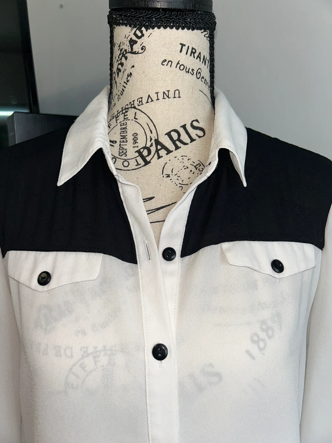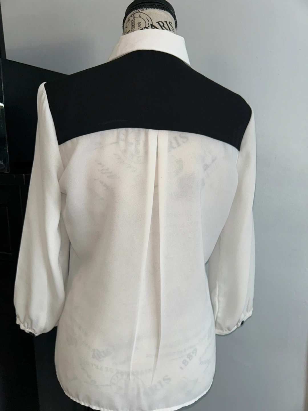 This is a Suzy Shier blouse with a classic black and white colour blocking design. It features a collared neckline and button-up front. The long sleeves have elasticated cuffs.