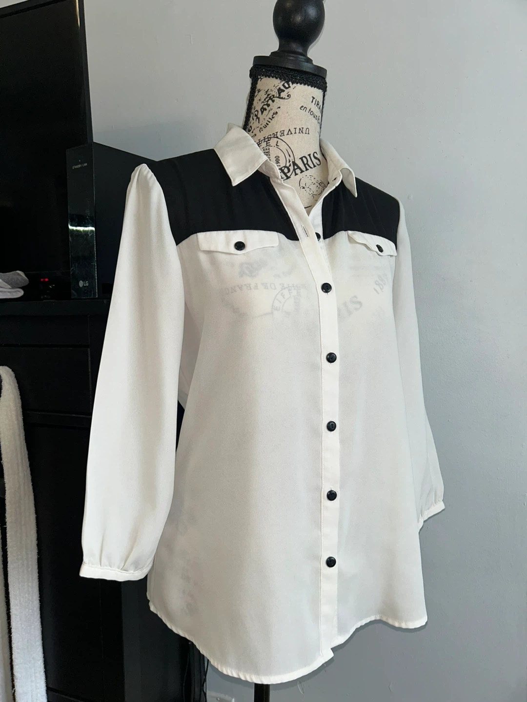 This is a Suzy Shier blouse with a classic black and white colour blocking design. It features a collared neckline and button-up front. The long sleeves have elasticated cuffs.