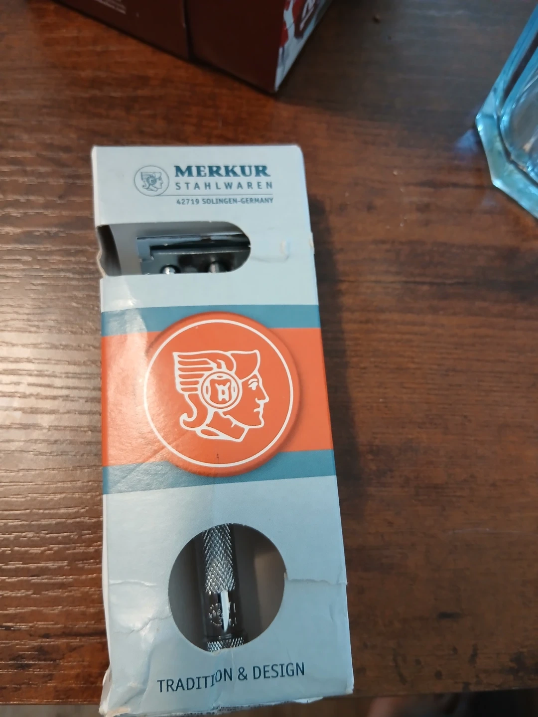 Merkur Stahlwaren safety razor from Solingen, Germany. Features a textured handle for grip. Made with traditional craftsmanship and design.