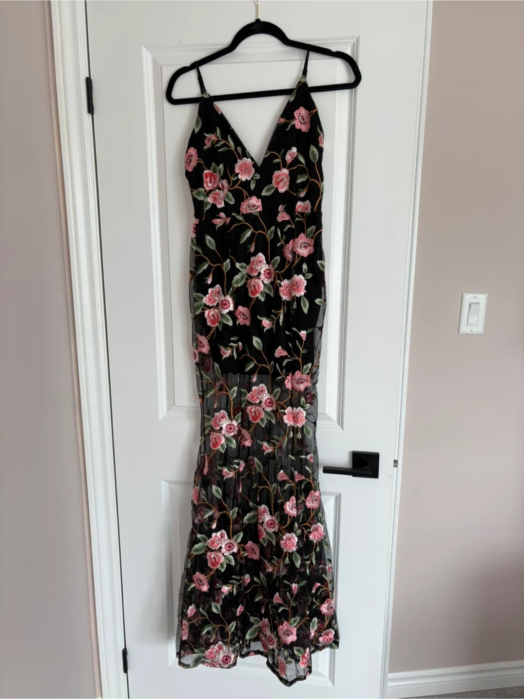 This stunning black gown by Chelsea & Violet features delicate pink and green floral embroidery throughout. The mesh overlay adds a beautiful texture, perfect for a special occasion. It has a flattering V-neckline and a sleek, form-fitting silhouette.