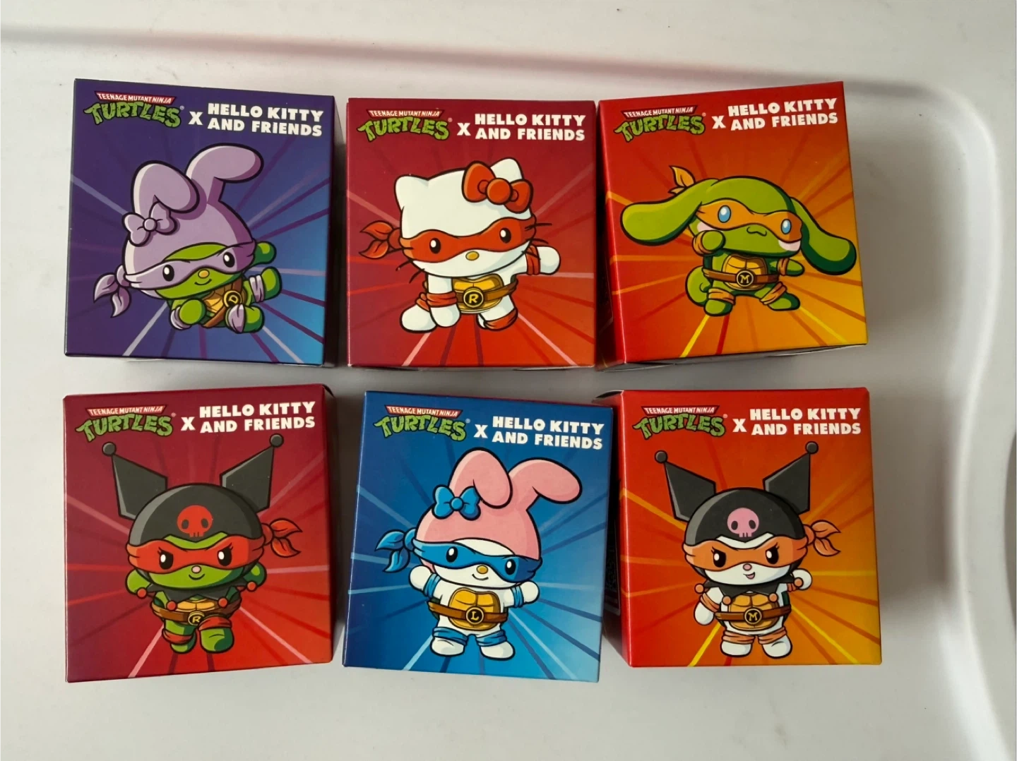 Set of 6 collectible figures from the Hello Kitty x Teenage Mutant Ninja Turtles collaboration. Each figure features a unique character design combining elements of both franchises. These are great for collectors and fans of either brand!