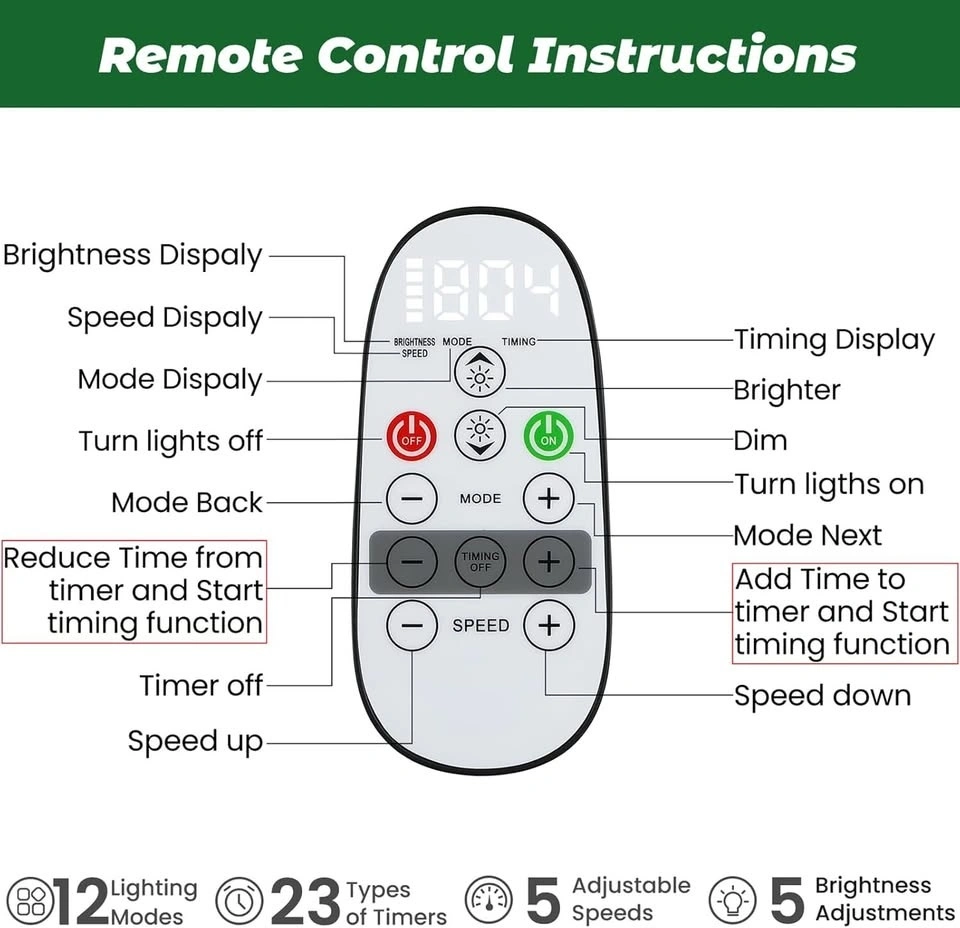 Remote Control with timer choices, brightness/speed levels, and lighting modes. (Note: batteries are not included.)