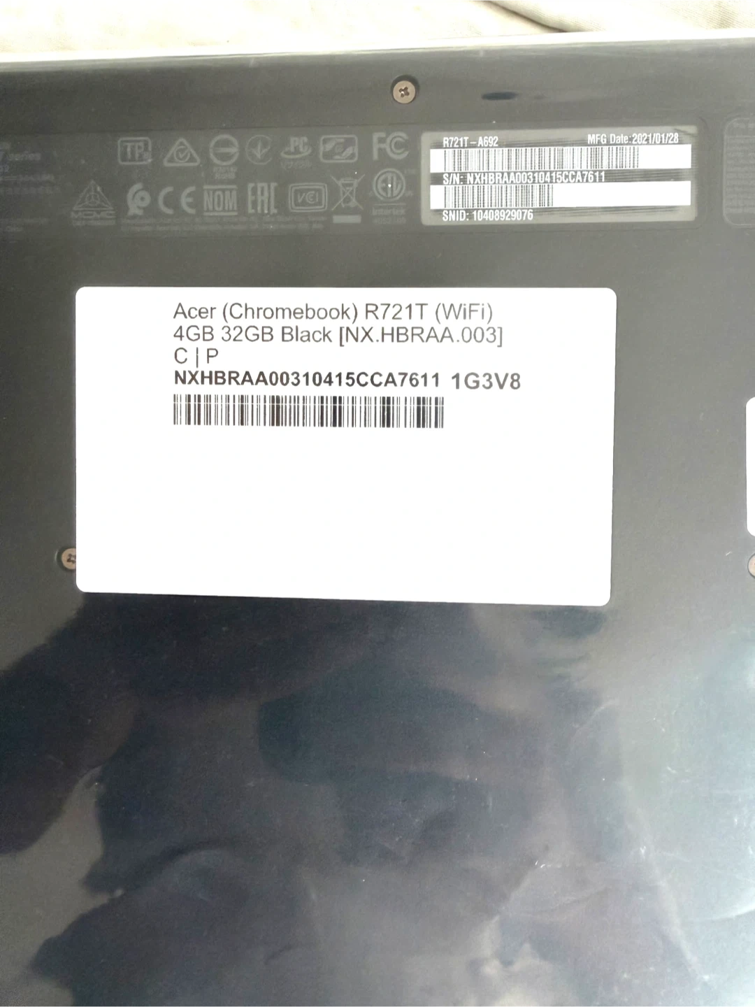 Acer Chromebook R721T (WiFi). 4GB RAM, 32GB storage. Black color. Manufactured 2021/01/28. This Chromebook is great for everyday tasks like browsing and email. No charger