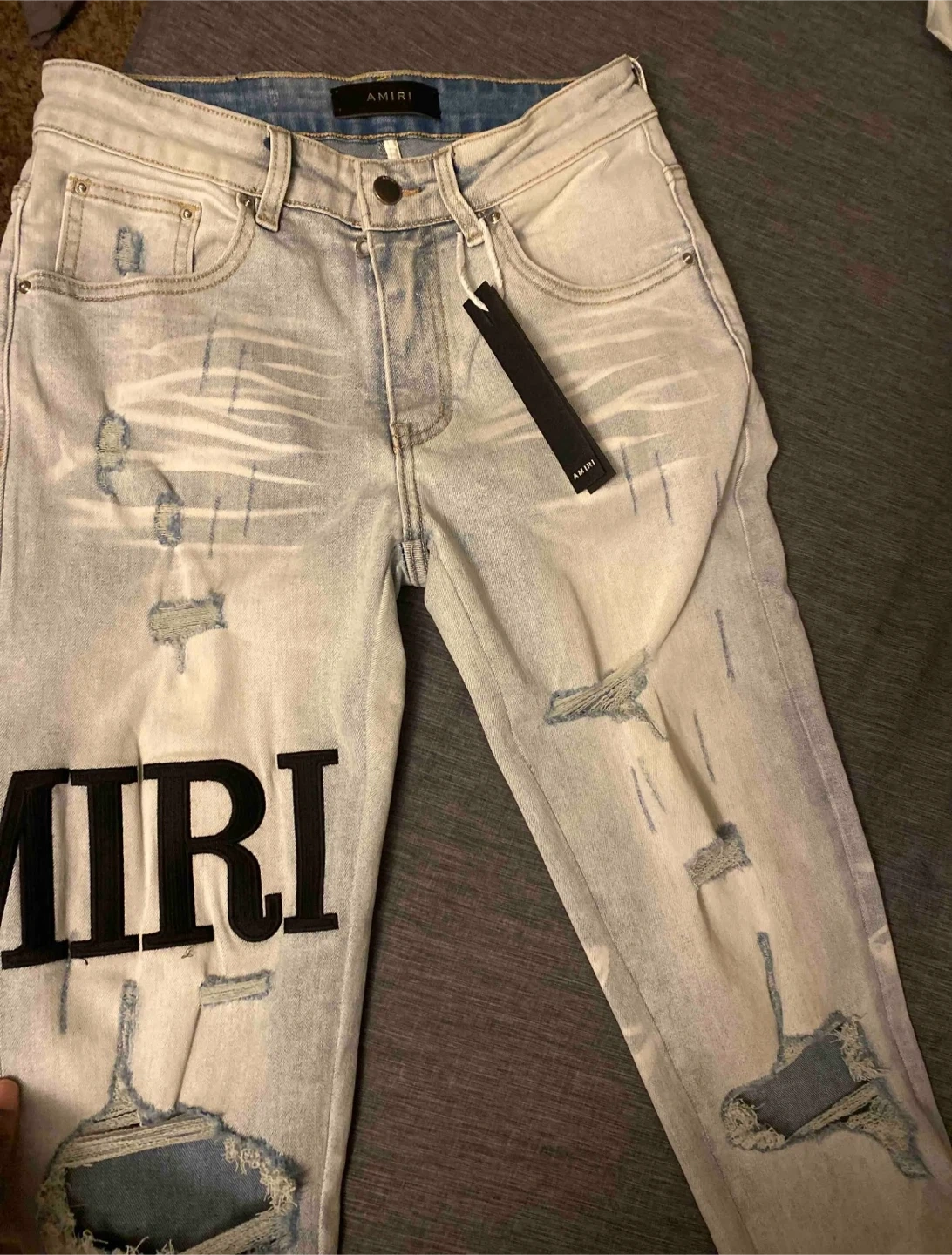 These AMIRI jeans have a light wash and distressed detailing throughout. They feature a large "AMIRI" logo graphic on the leg. Denim material.