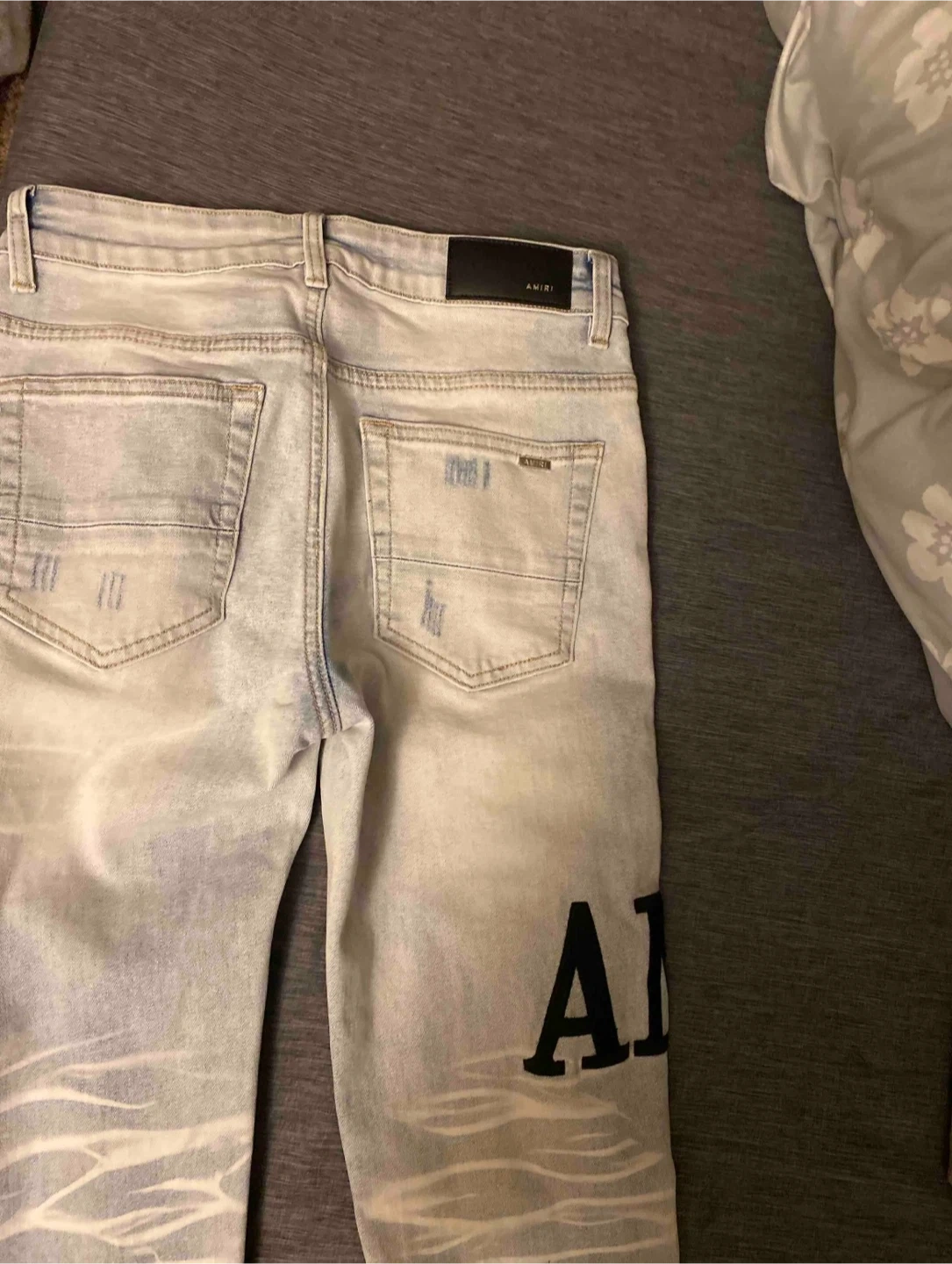 These AMIRI jeans have a light wash and distressed detailing throughout. They feature a large "AMIRI" logo graphic on the leg. Denim material.