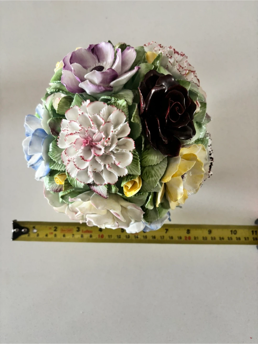 A beautiful Royal Daultonporcelain floral arrangement with vibrant roses and carnations. This piece adds a touch of elegance to any room. Crafted from high-quality porcelain.