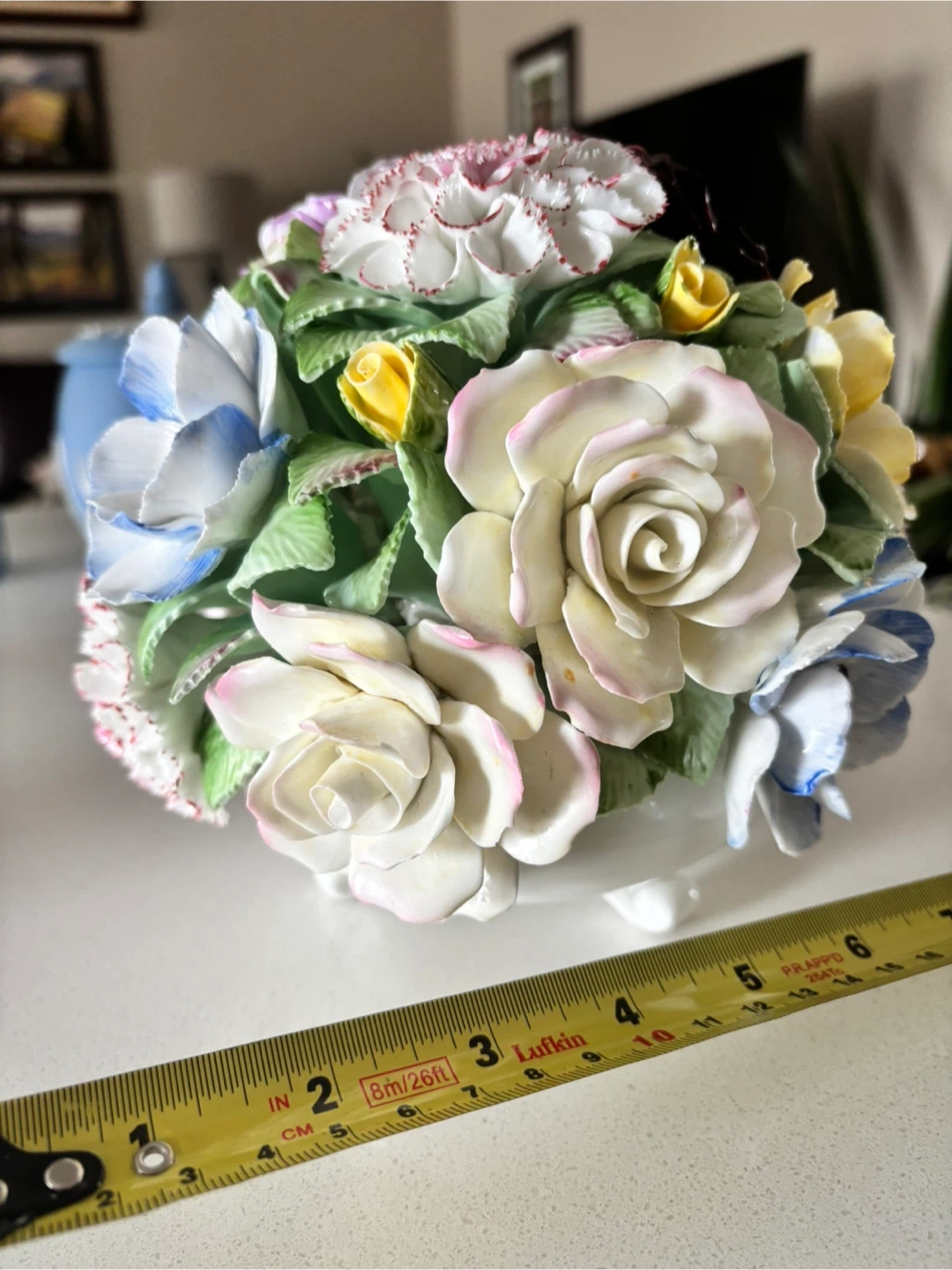A beautiful Royal Daultonporcelain floral arrangement with vibrant roses and carnations. This piece adds a touch of elegance to any room. Crafted from high-quality porcelain.