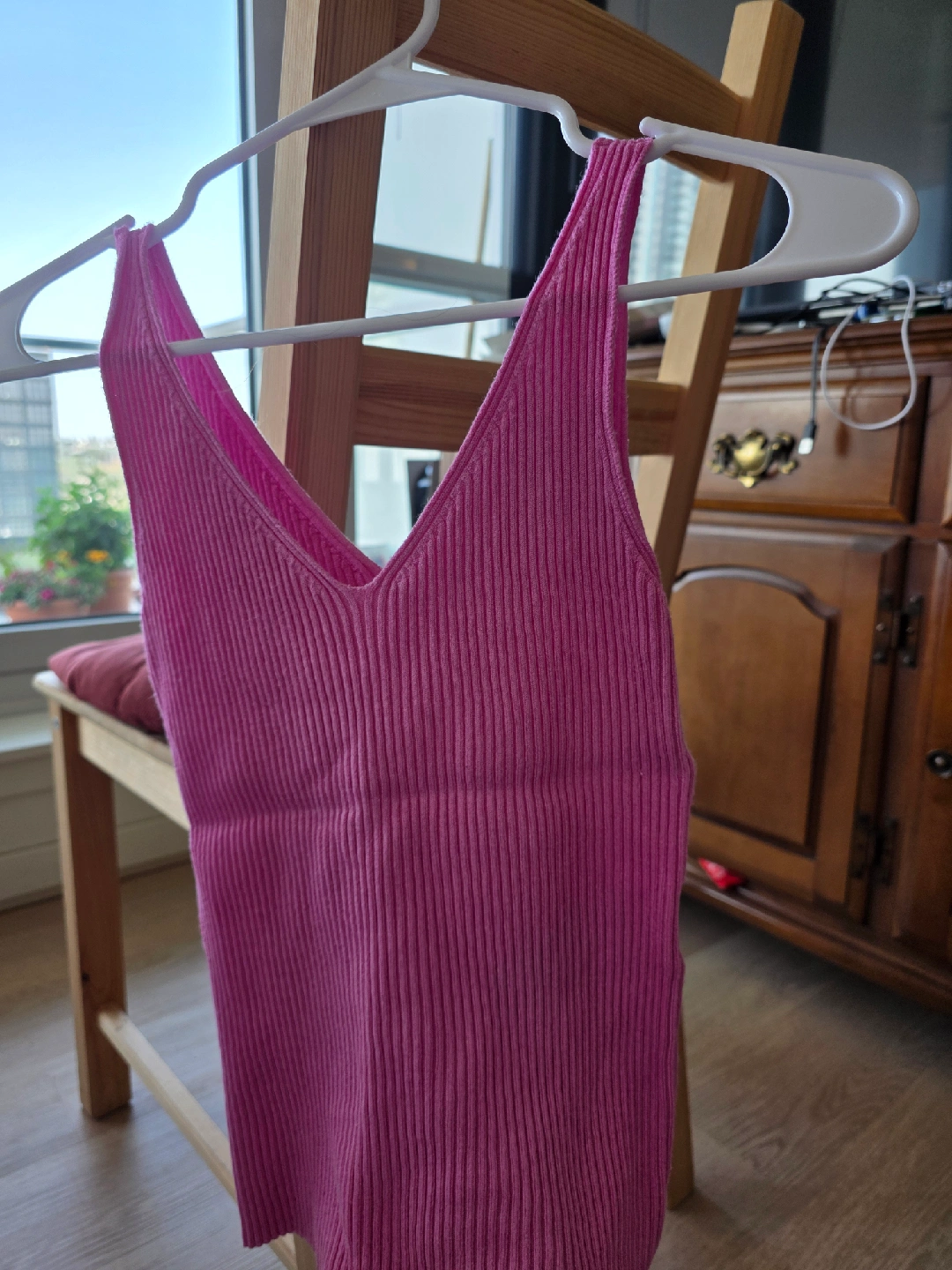Ribbed knit V-neck top from VERO MODA in a bright fuchsia shade. Stretchy, slim fit with wide straps and a cropped length — perfect for layering or wearing on its own.